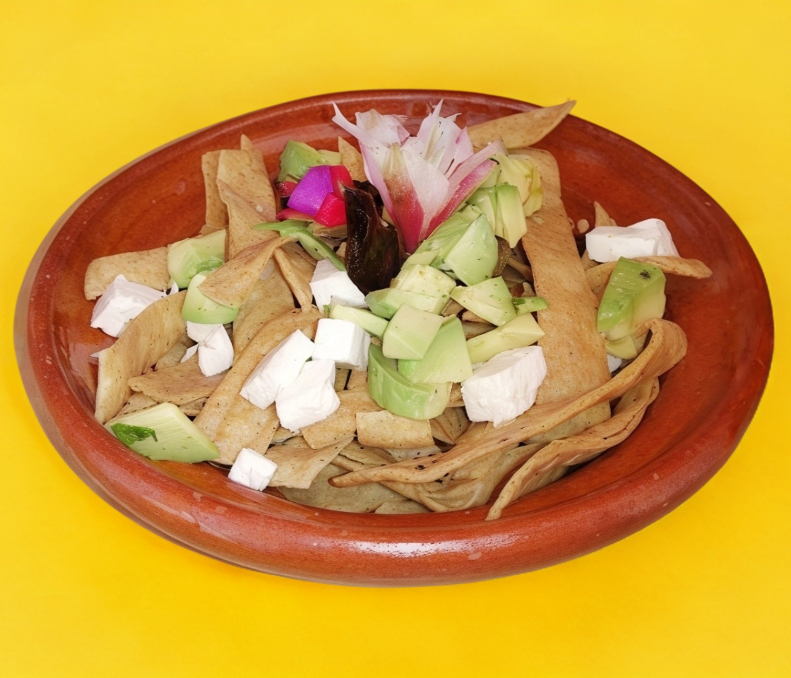Tiras de tortillas, queso panela, aguacate y crema, acompañado de un delicioso caldo de jitomate y chile pasilla