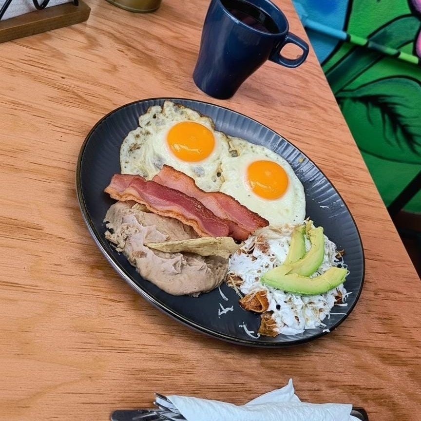 Huevos Estrellados con Tocino, acompañado con una pequeña porción de chilaquiles y frijoles