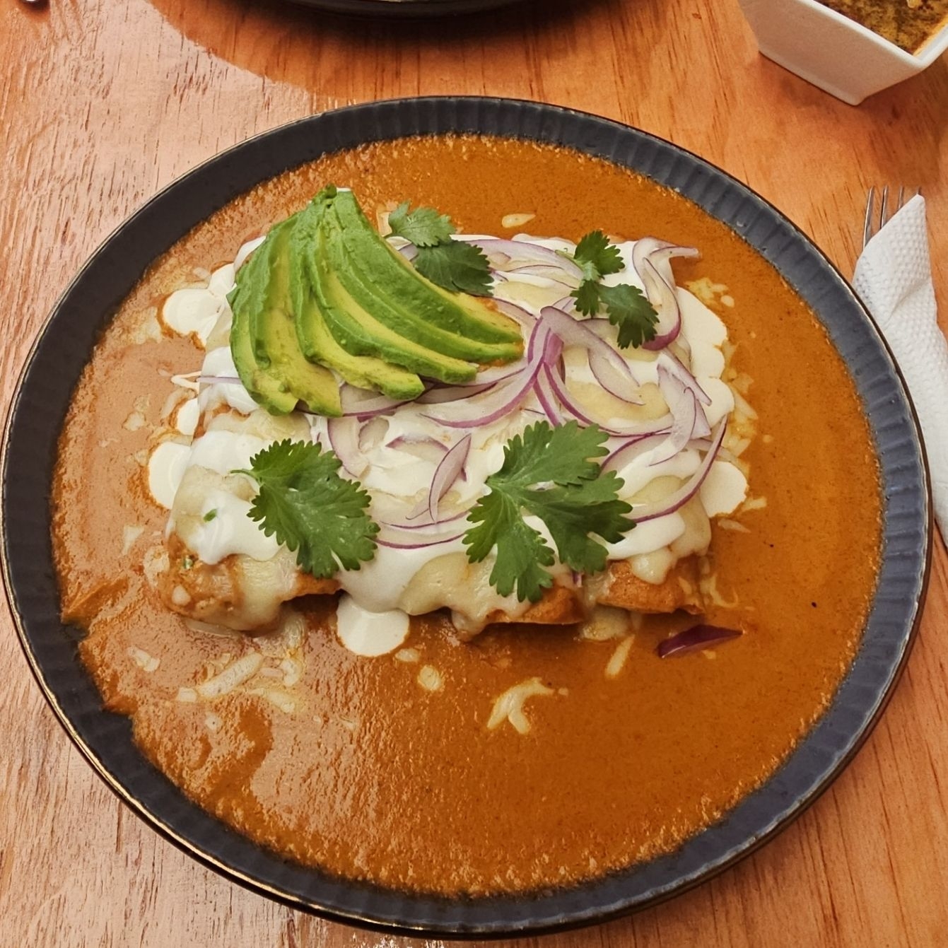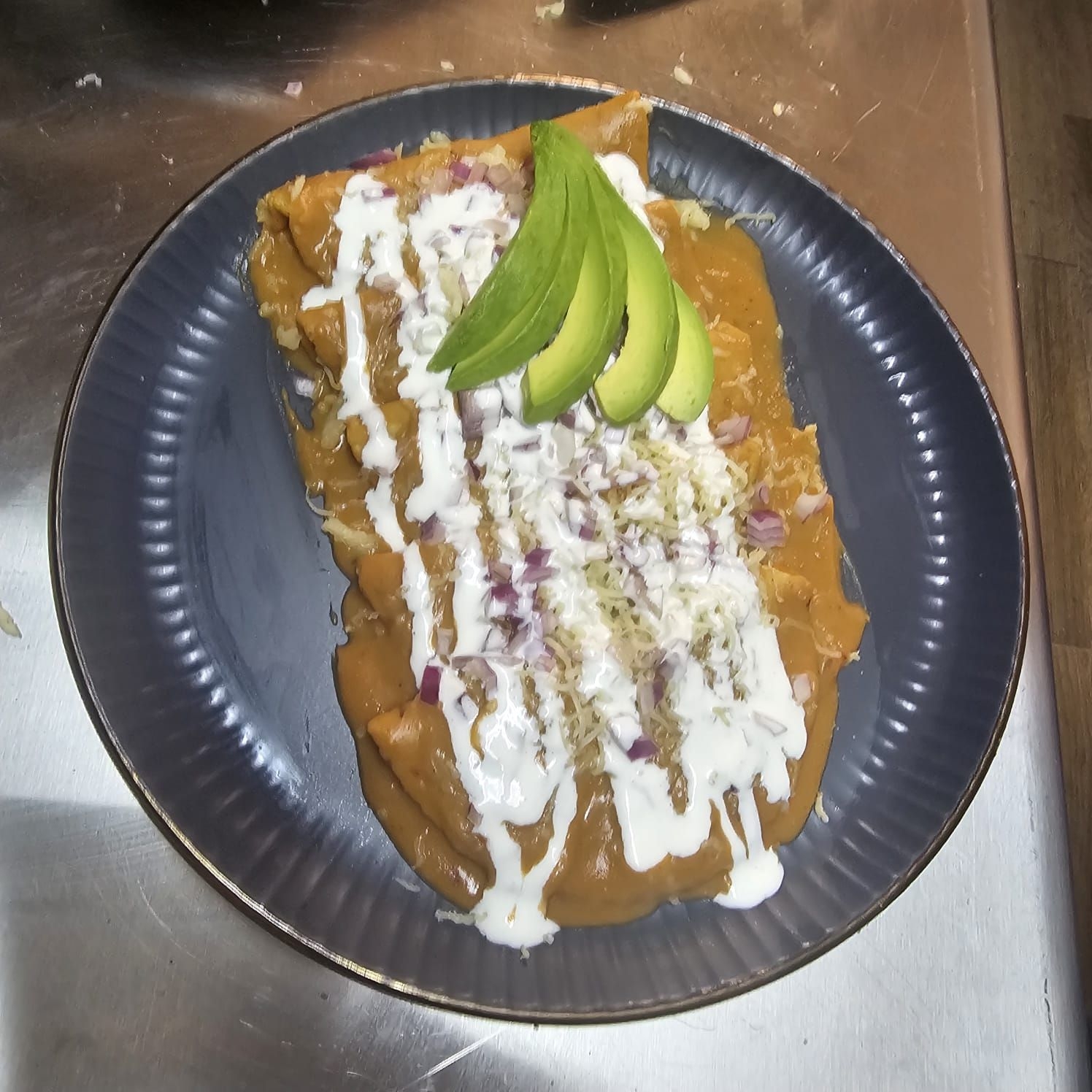 Cinco Enfrijoladas acompañadas con pollo, queso, crema, cebolla y aguacate