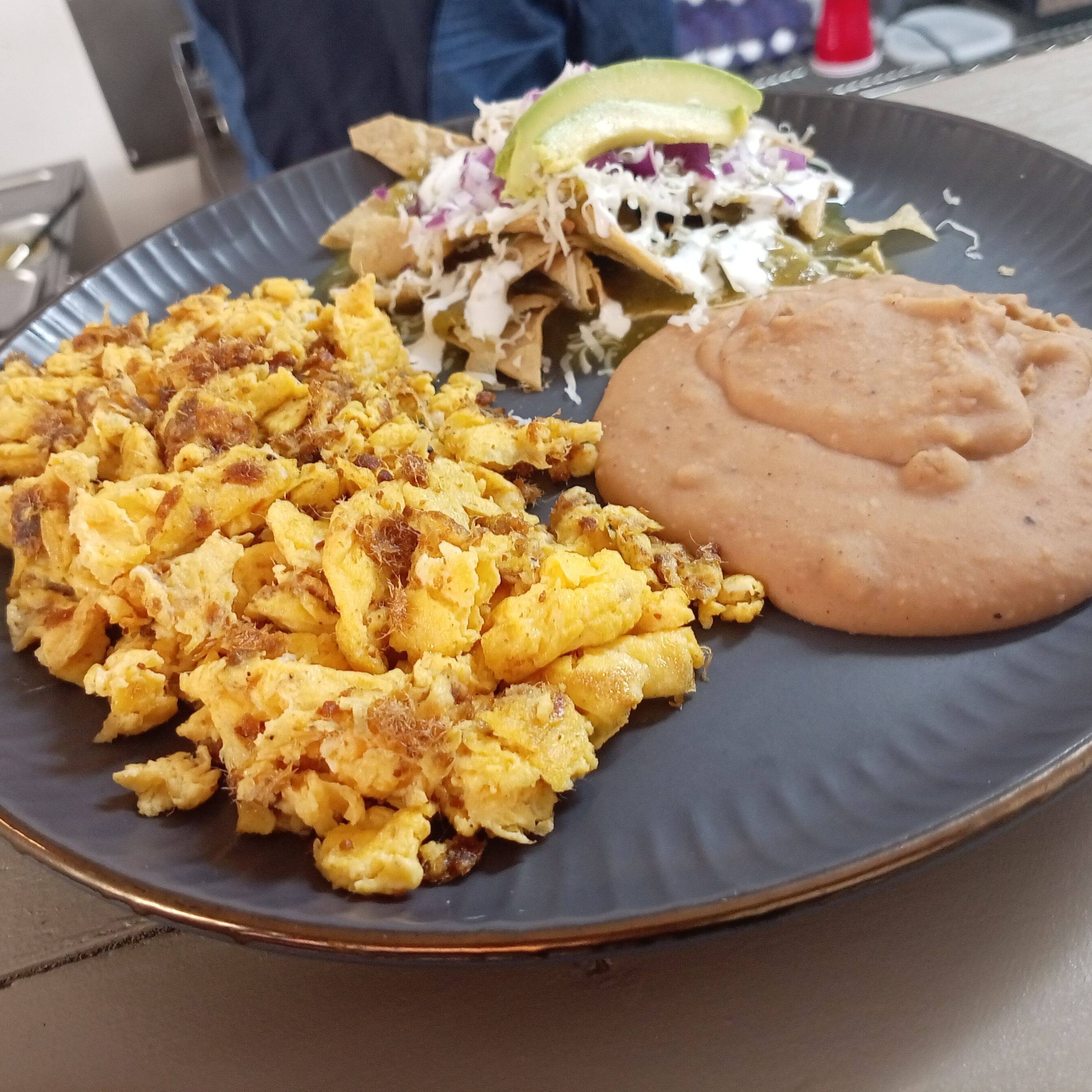 Huevo revuelto acompañado con trocitos de tocino y acompañados con una porción pequeña de frijoles refritos y una porción pequeña de chilaquiles