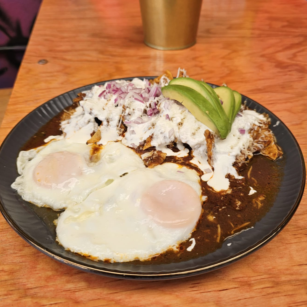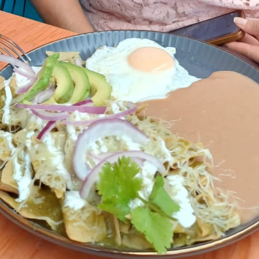 Chilaquiles Verdes salsa a elegir tradicional o cremosa, acompañados con huevo revuelto a y frijoles refritos.