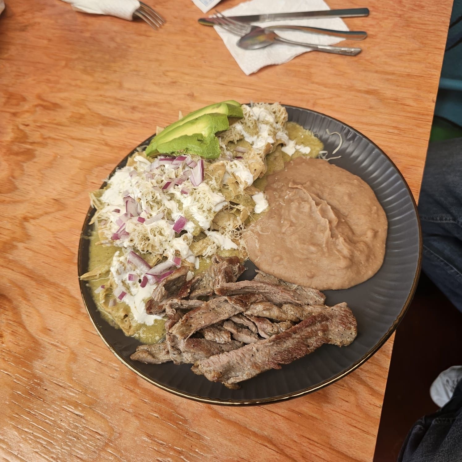Chilaquiles Verdes salsa a elegir tradicional o cremosa, acompañados con Arrachera y frijoles refritos.