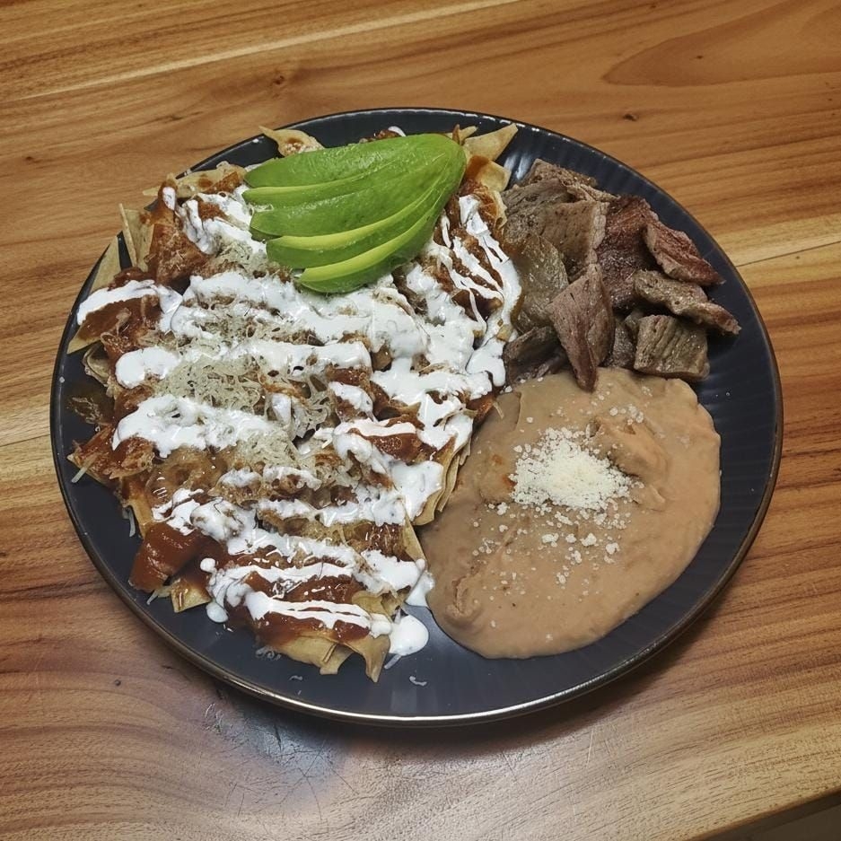 Chilaquiles rojos salsa a elegir tradicional o cremosa, acompañados con Arrachera y frijoles refritos.