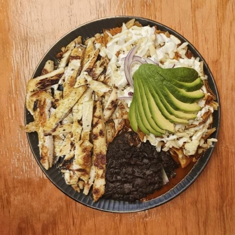 Chilaquiles Roja salsa a elegir tradicional o cremosa, acompañados con pollo a la plancha y frijoles refritos.