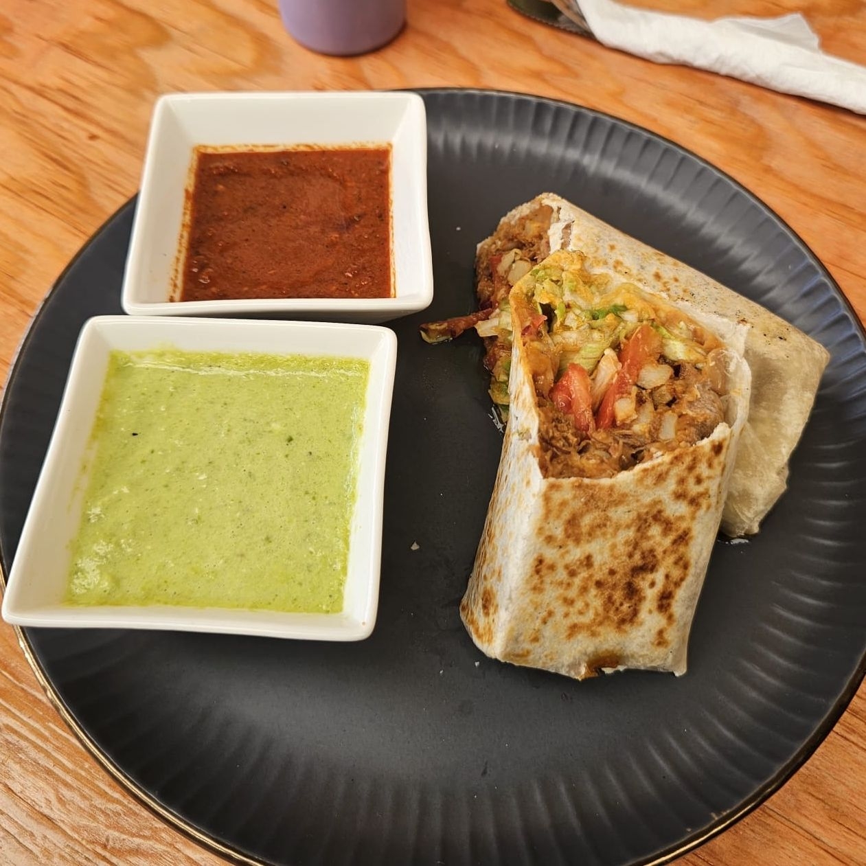Burritos estilo Chihuahua de cochinita acompañados de sus respectivas salsas y guacamole