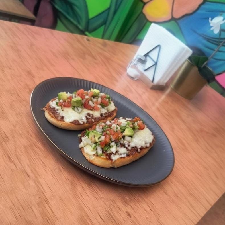 Molletes Naturales con frijoles refritos, queso, crema. Acompañado con pico de gallo