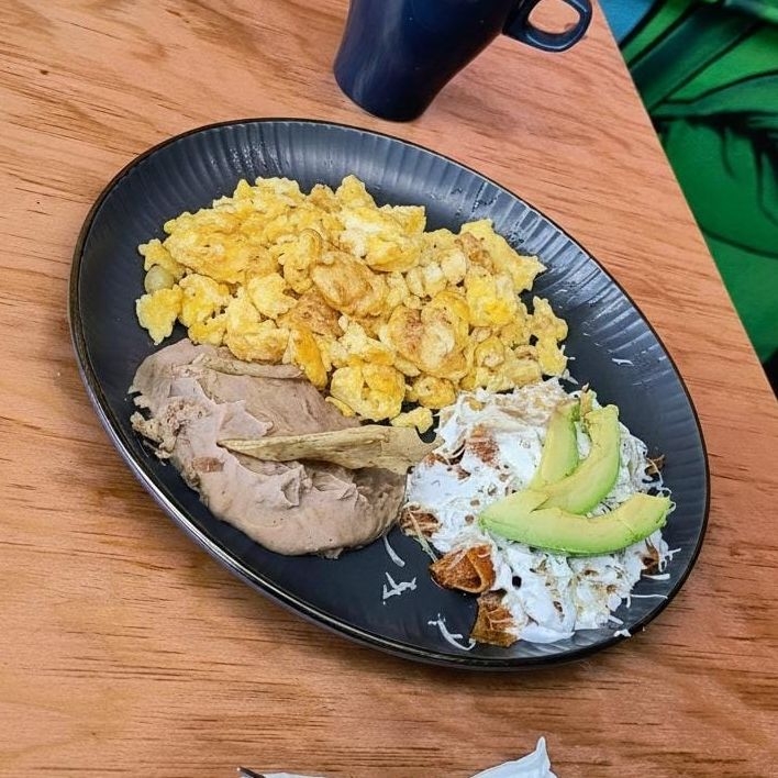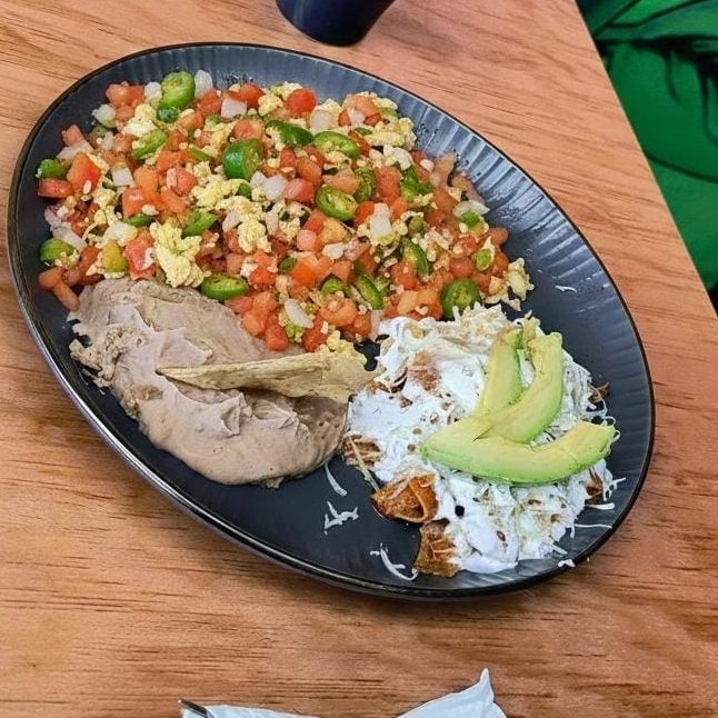Huevo revuelto a la mexicana con una porción pequeña de frijoles refritos y una porción pequeña de chilaquiles