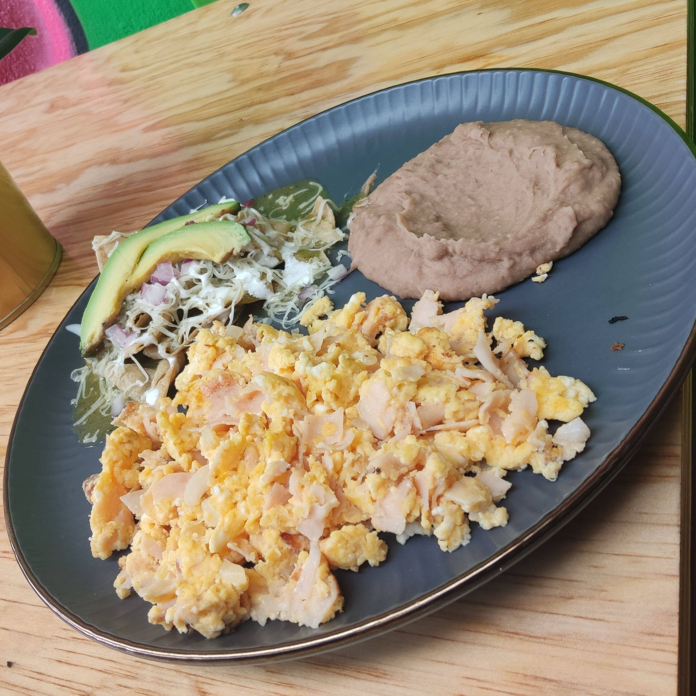 Huevo revuelto con jamón, acompañado con una pequeña porción de chilaquiles y frijoles