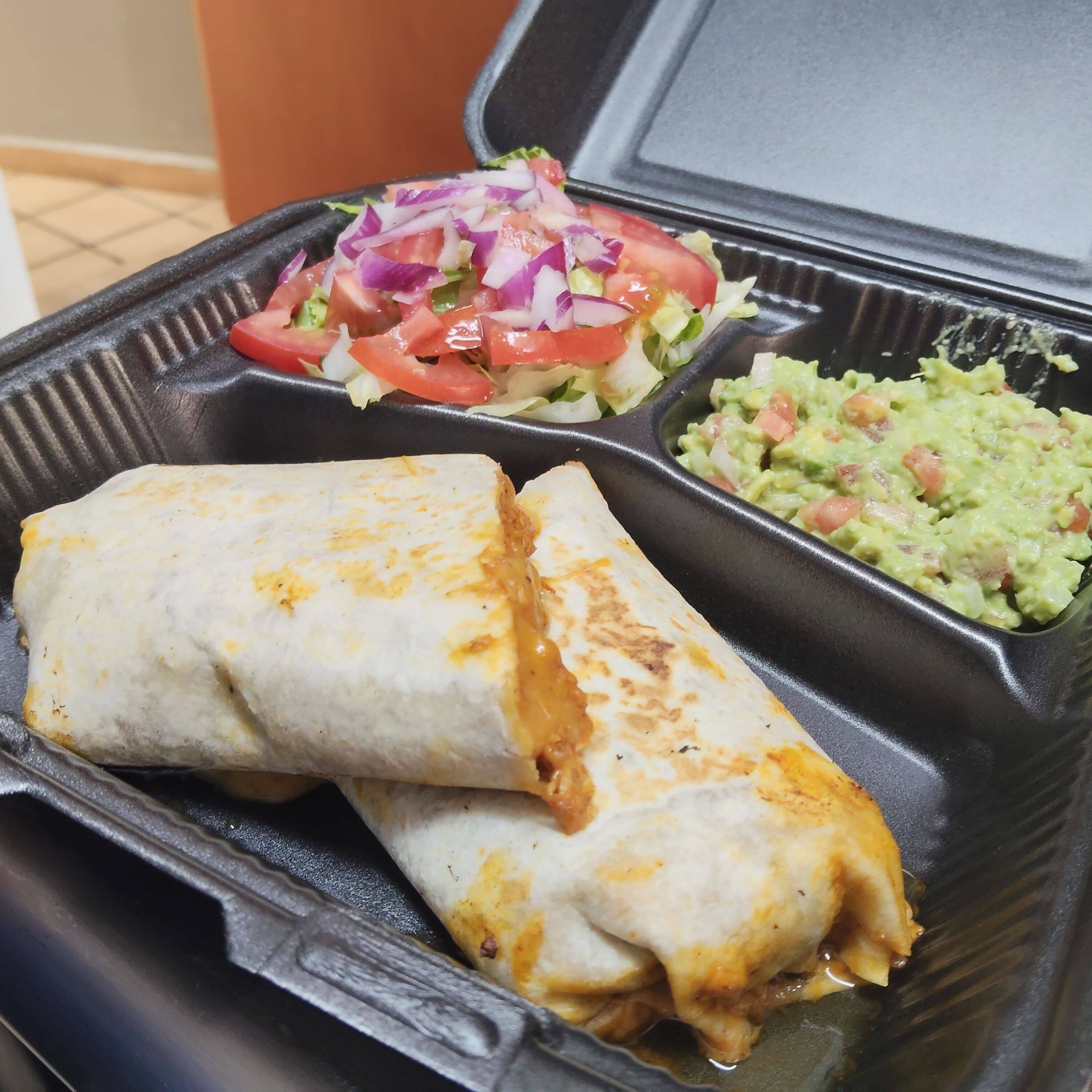 Burritos estilo Chihuahua con frijoles queso y papas con chorizo, acompañado de ensalada, guacamole y sus respectivas salsas