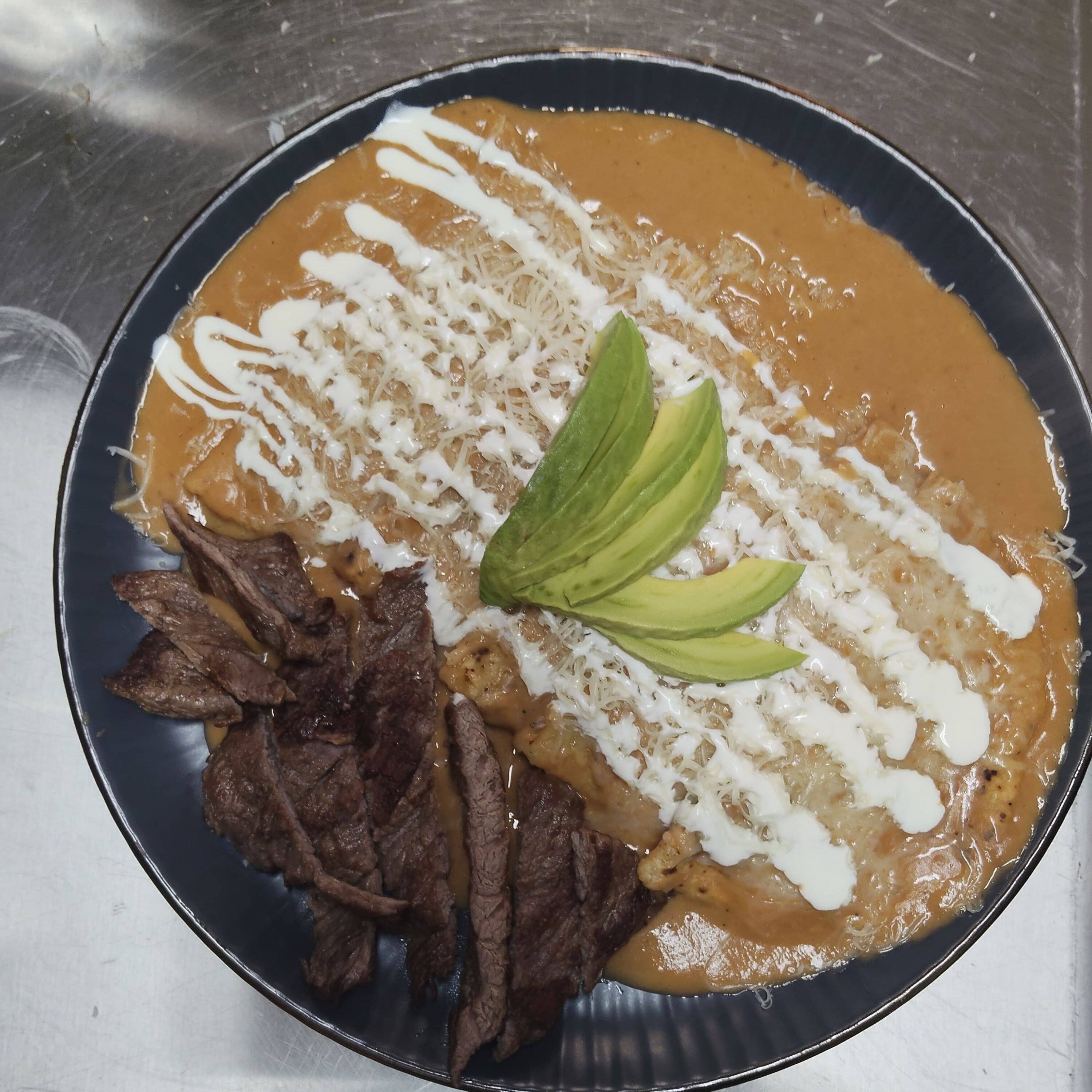 Cinco Enfrijoladas acompañadas de arrachera, queso, crema, cebolla y aguacate