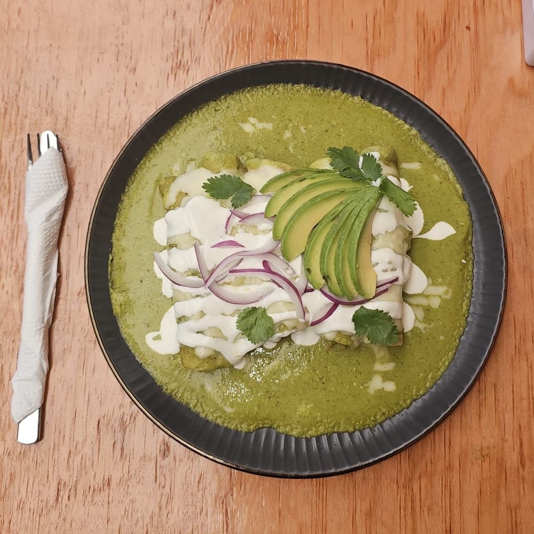 Cinco enchiladas verdes suizas rellenas de pollo acompañadas de una pequeña porción de frijoles