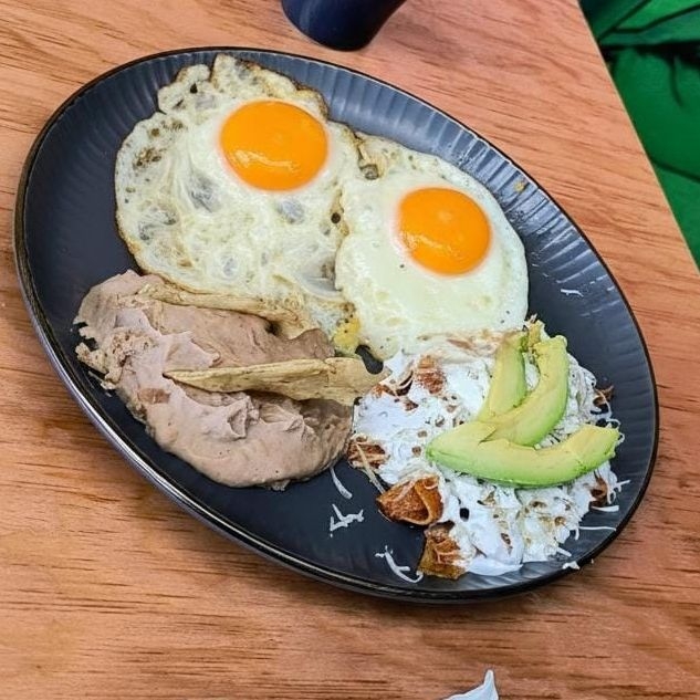 Huevos Estrellados Naturales, acompañados de una porción pequeña de frijoles refritos y una porción pequeña de chilaquiles