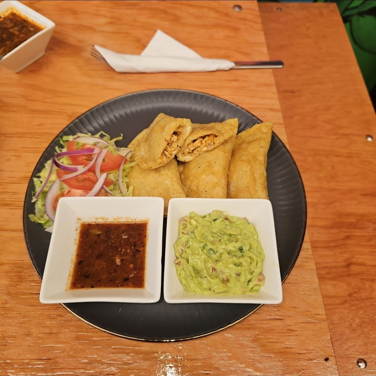 4 empanadas de masa de maiz surtidas queso, chicharrón, cochinita y pollo. Acompañadas de una ensalada de lechuga,guacamole y sus salsas