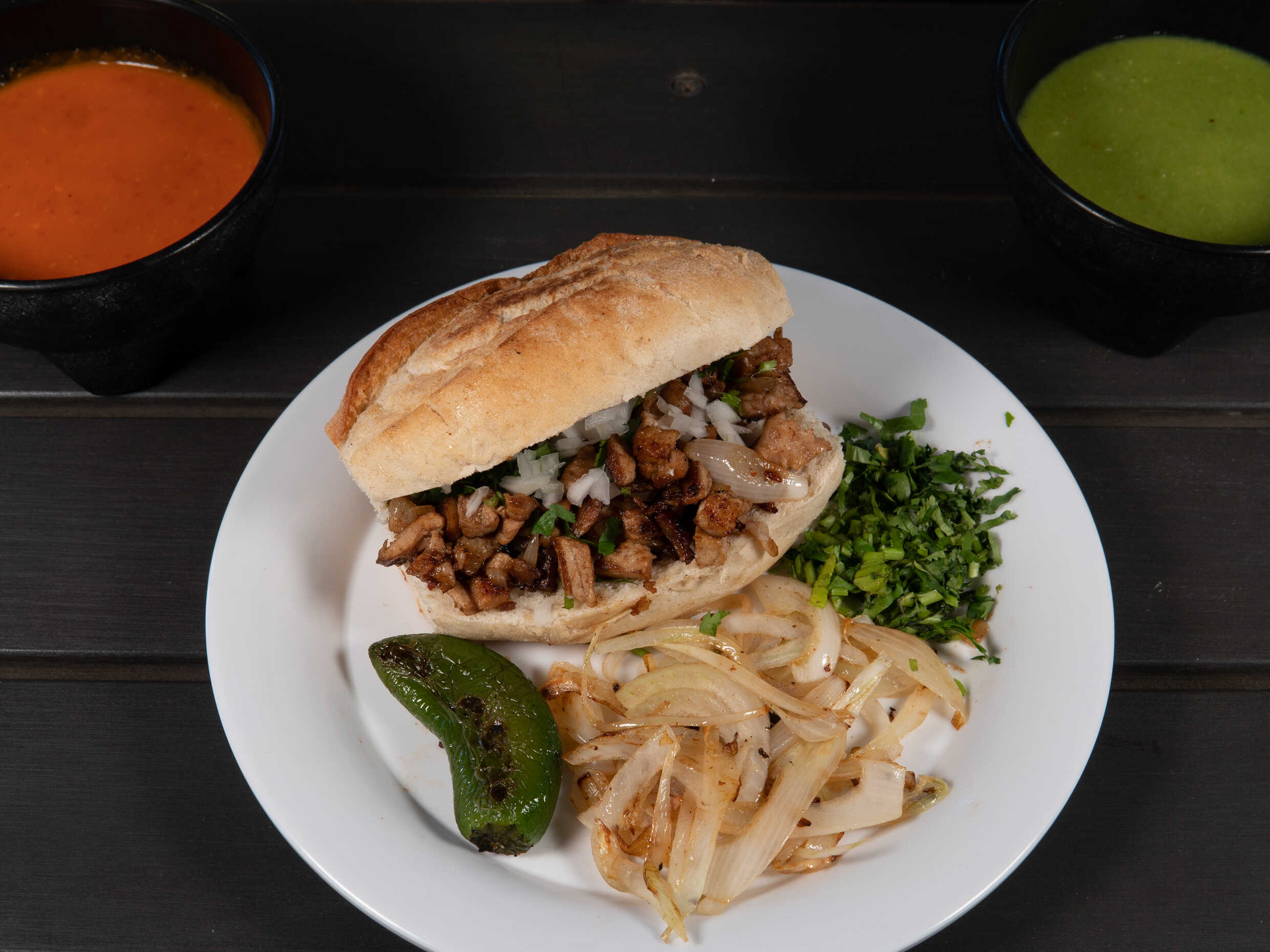 Bolillo de pan con deliciosa carne, incluye salsas, limón y verduras.
