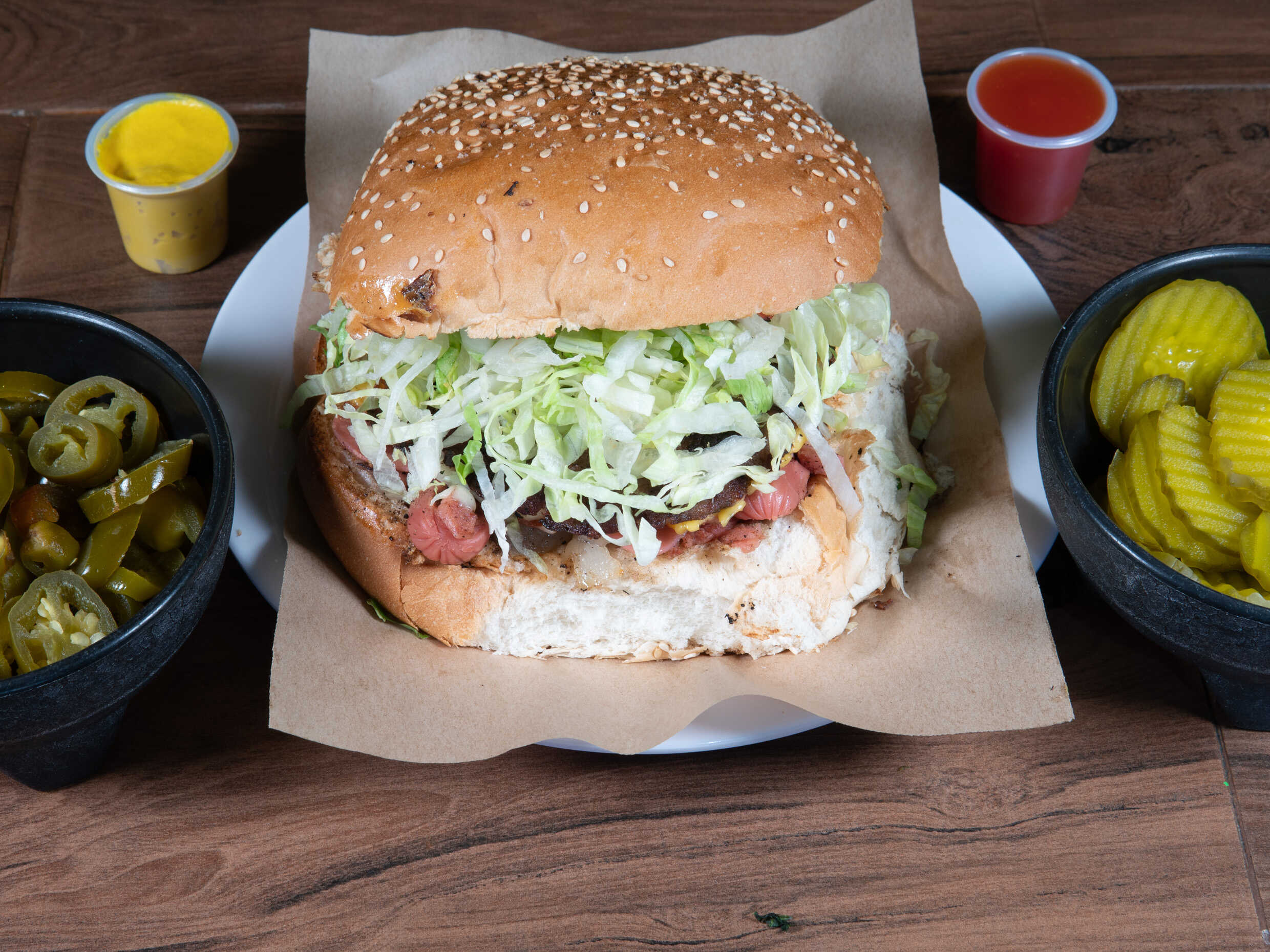 3 Piezas de pan de hamburguesa grande con 2 milanesas, piña, champiñones, tocino, salchicha, jamón, queso amarillo, queso asadero, verdura y aderezos.