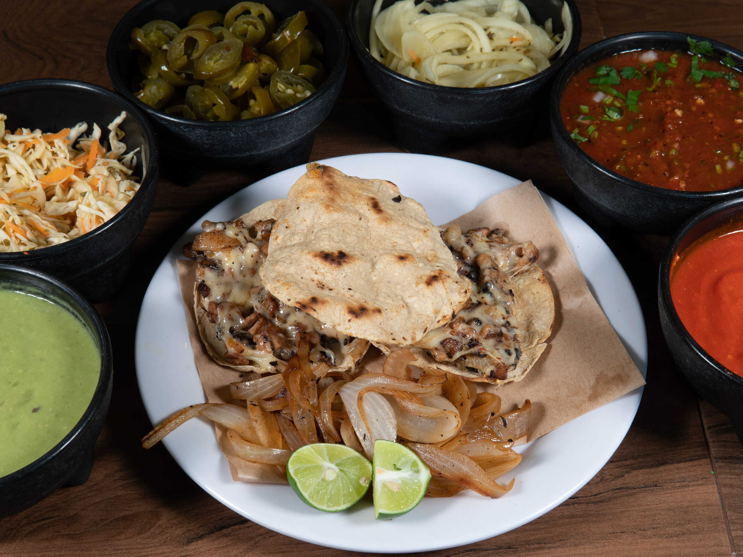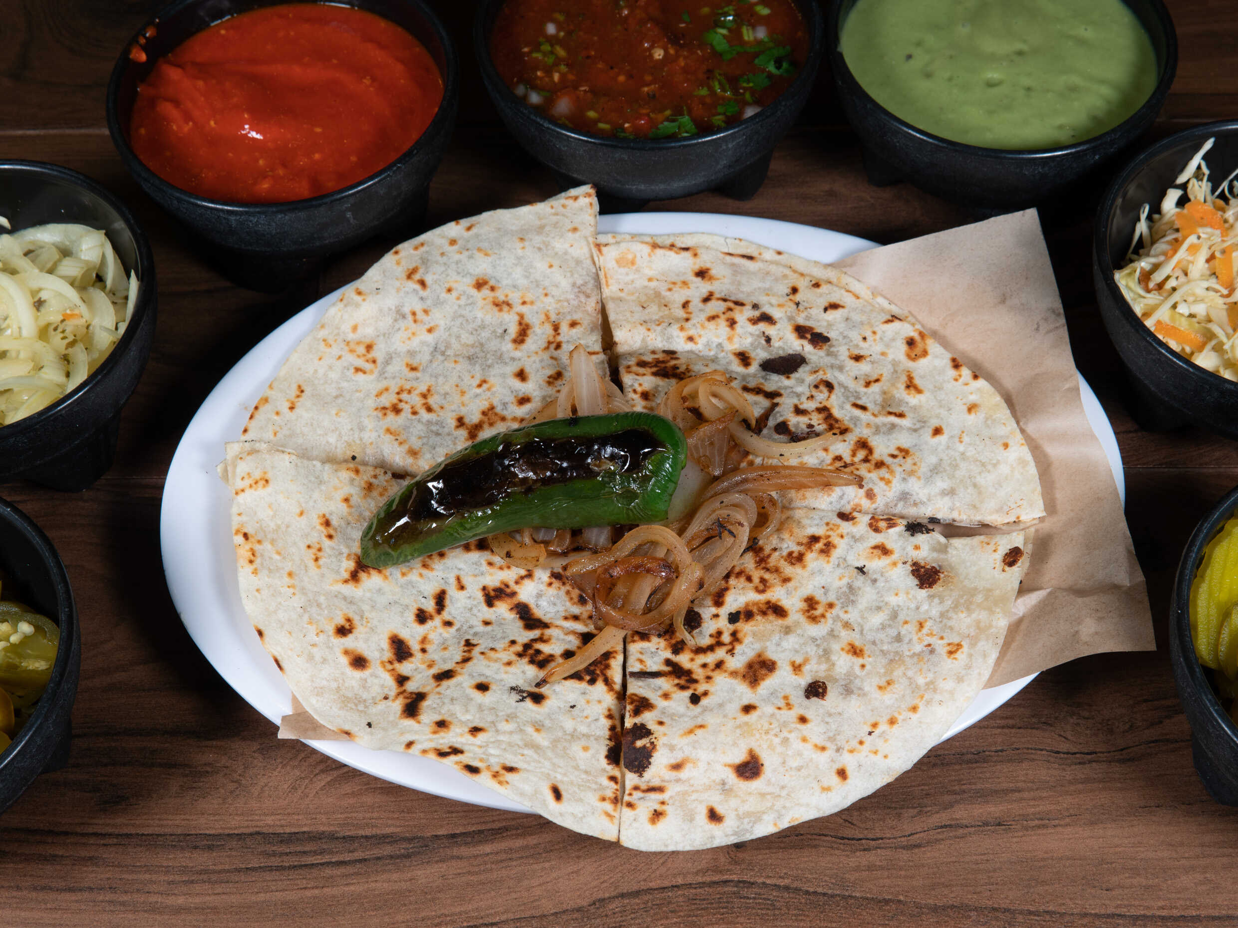 Doble tortilla de harina con carne y queso, incluye salsas, limón y verduras.