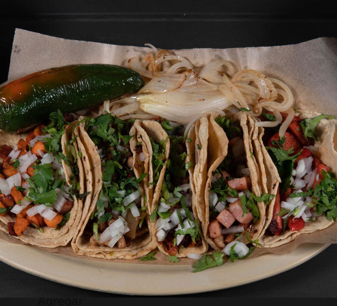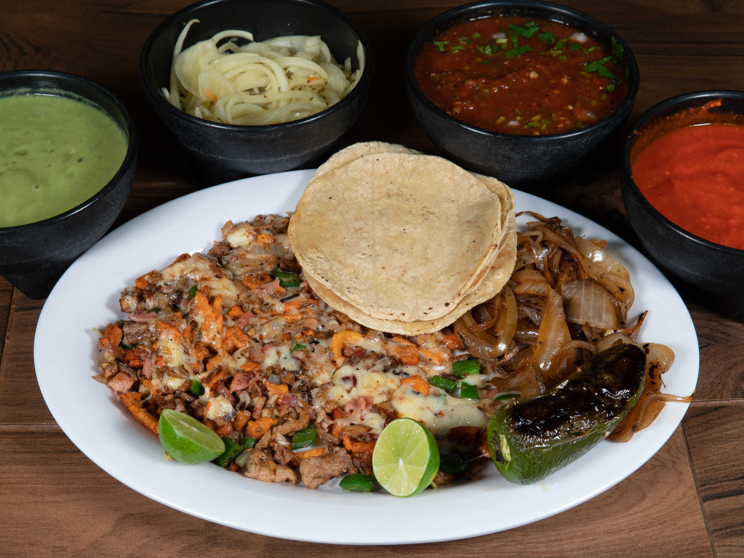 3 Carnes de tu elección con cebolla, chile morrón, tocino y queso fundido, incluye tortillas, salsas y verduras.