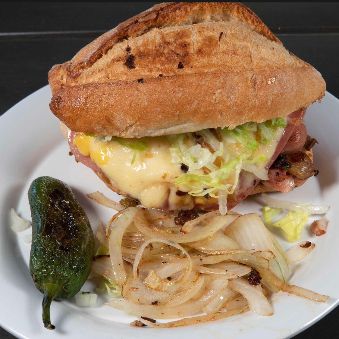 Pan de media noche con salchichón, tocino, queso asadero, verdura y aderezos.
