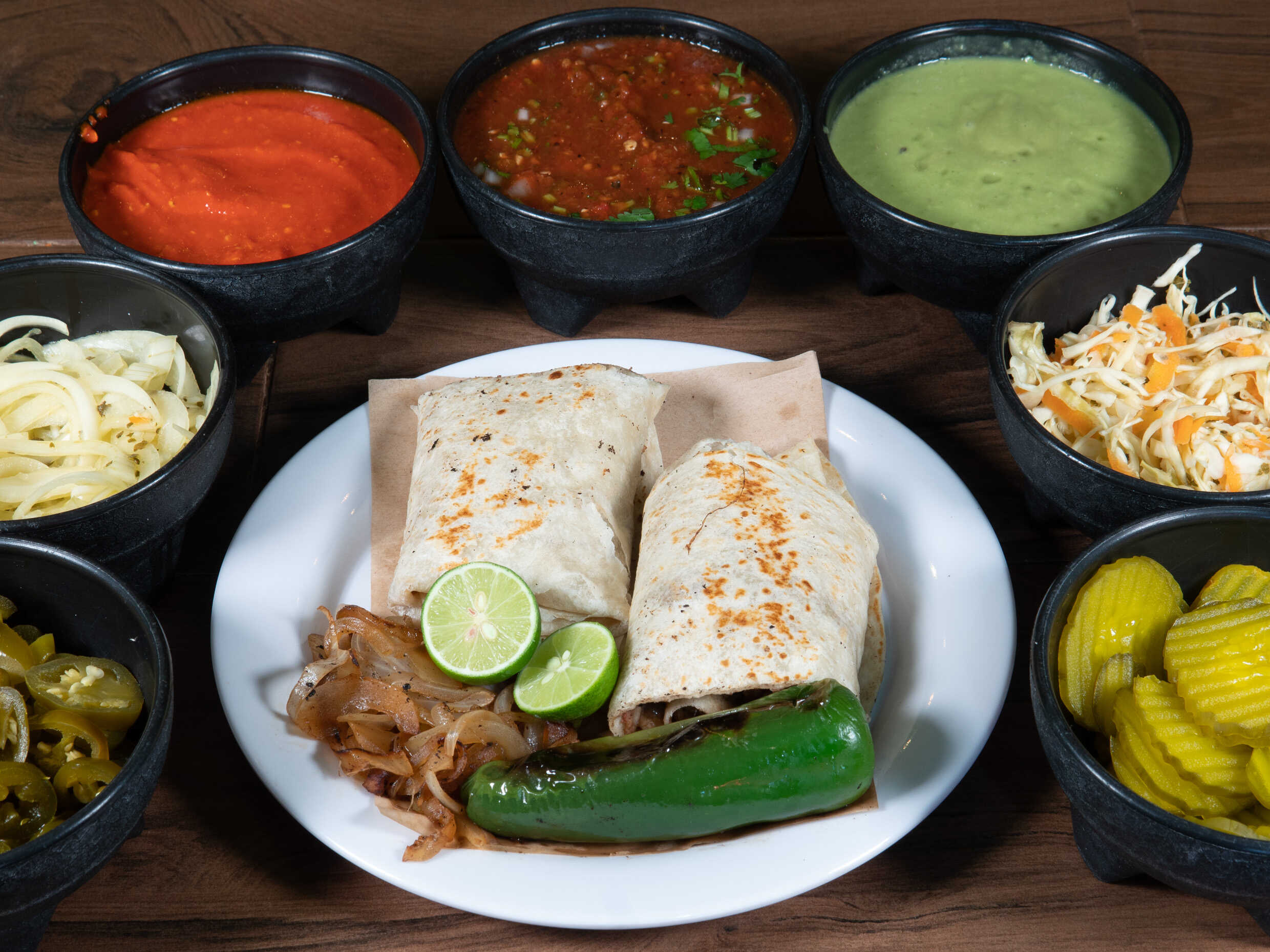 Doble tortilla gigante de harina con carne y queso, incluye salsas, limón y verduras.