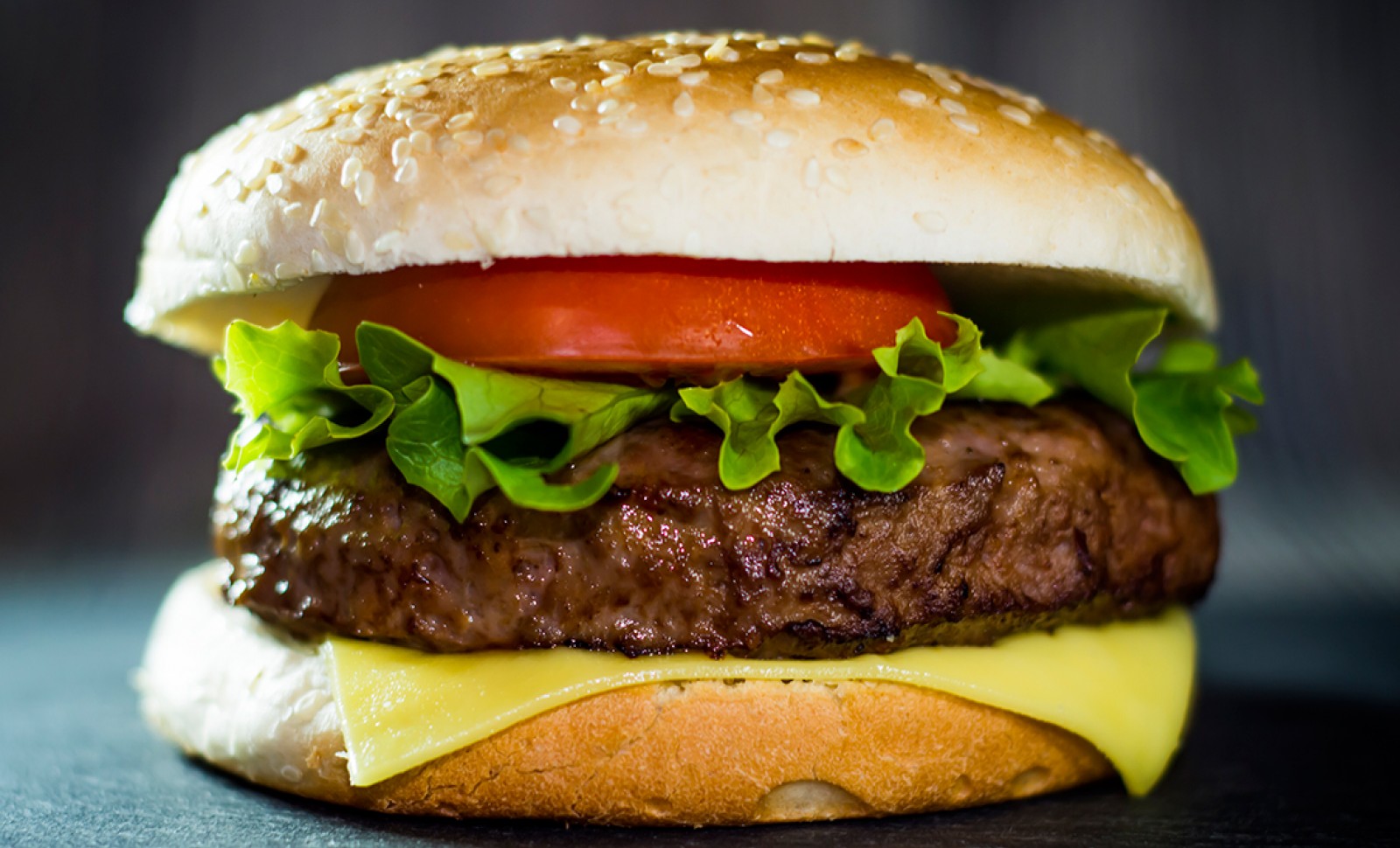 Pan de hamburguesa con milanesa, verdura y aderezos.