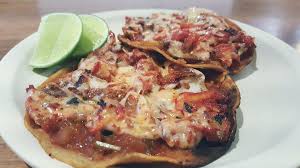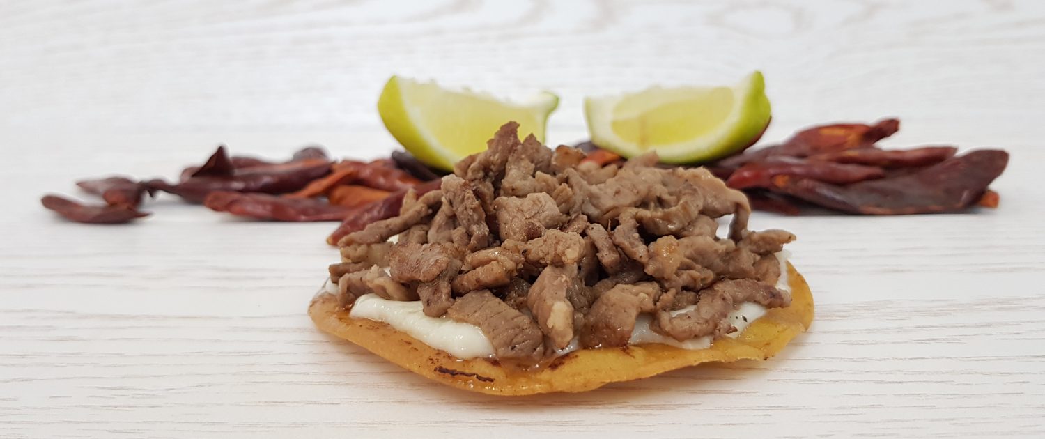 Tortilla de maíz tostada con carne y queso fundido, incluye salsas, limón y verduras.