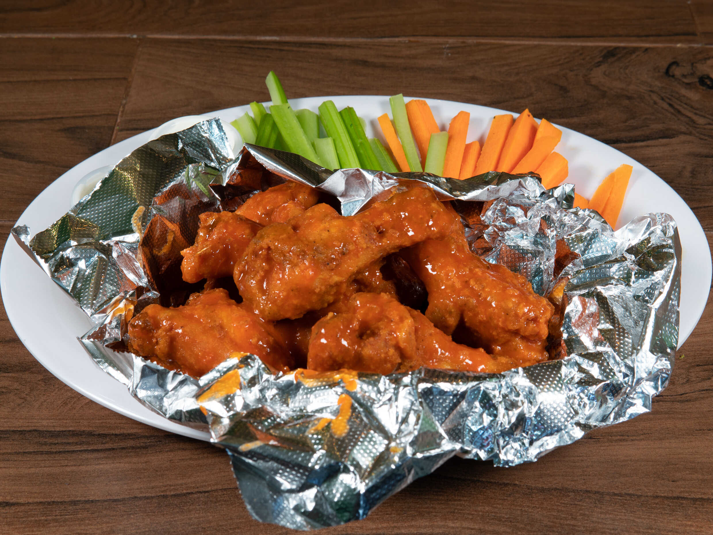 8 Piezas de alitas en salsa de tu elección, incluye verduras y aderezos.