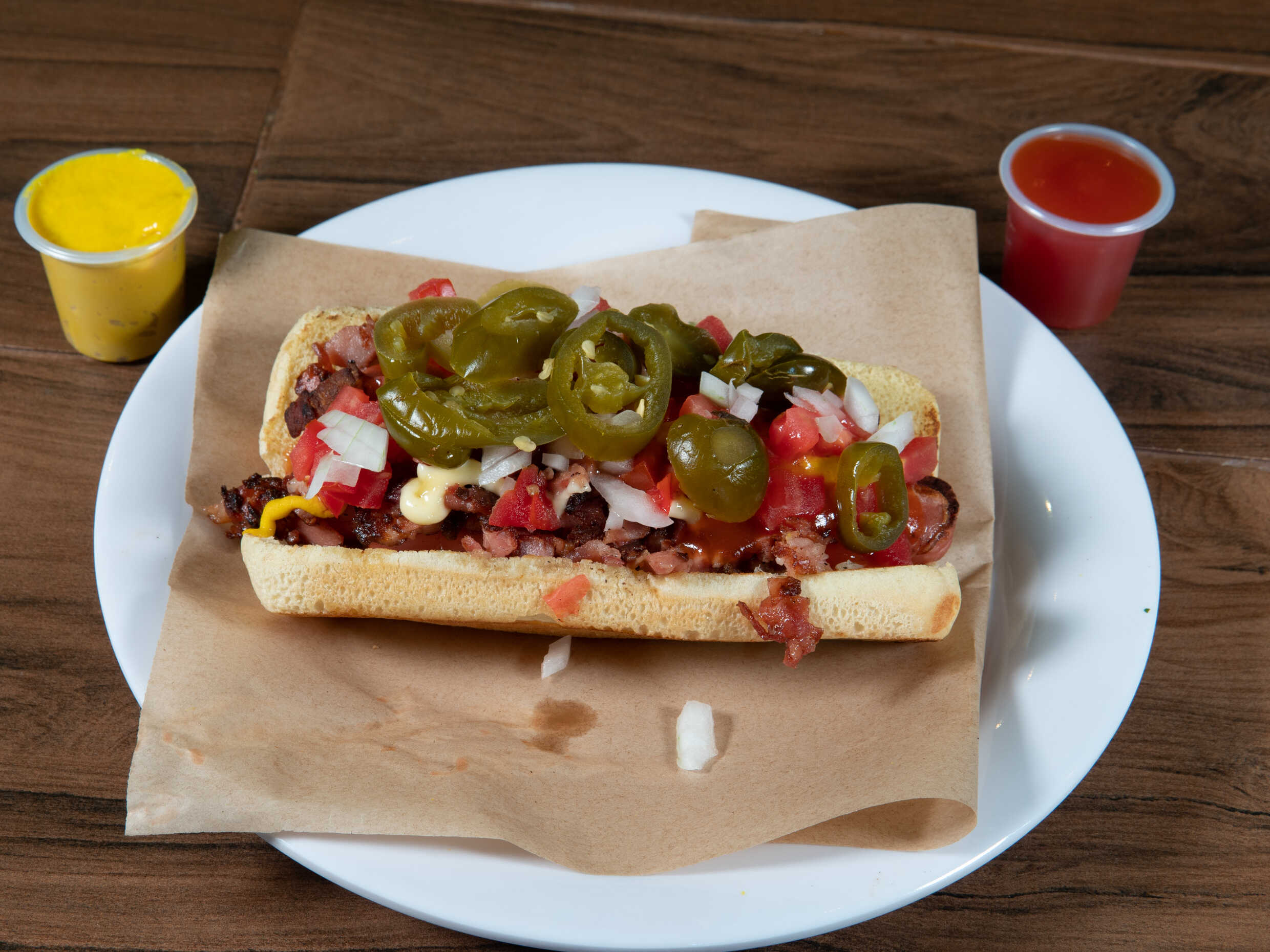 Pan de media noche con salchicha, tocino, jamón, queso amarillo, verdura y aderezos.