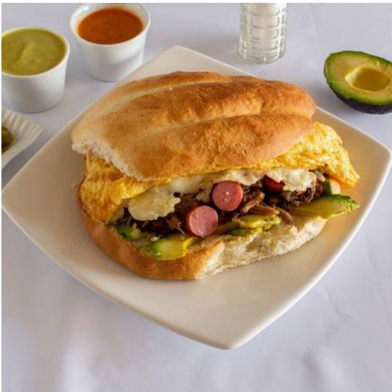 Lomo, salchicha, huevo en torta y queso blanco. Acompañada de aguacate, jitomate y mayonesa.