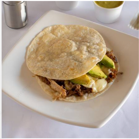Pastor y queso blanco. Acompañada de aguacate, jitomate y mayonesa.