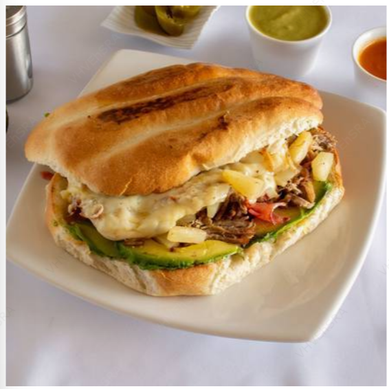 Bistec y queso blanco. Acompañada de aguacate, jitomate y mayonesa.