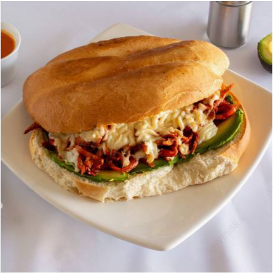 Lomo y queso blanco. Acompañada de aguacate, jitomate y mayonesa.