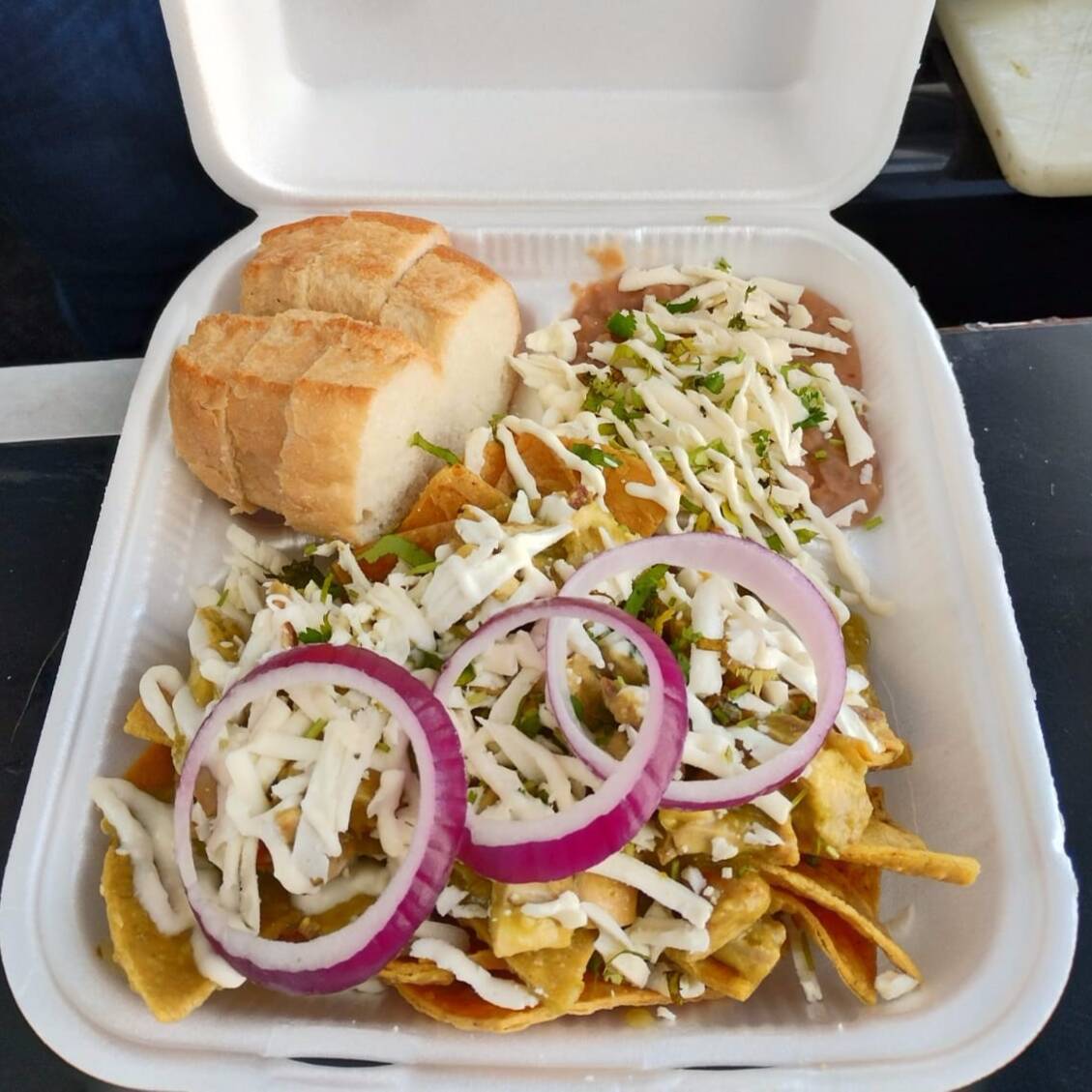 Totopos bañados en salsa verde picosa con proteína a elegir. Se acompaña de frijoles con queso y crema y rodajas de bolillo. Lo que ves en la foto es lo que te llega.