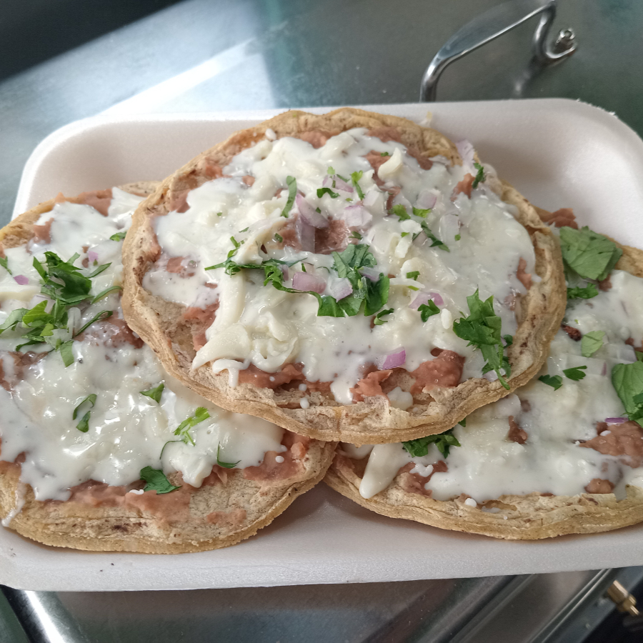 Orden de 3 sopes. Llevan frijolitos sazonados, queso Oaxaca, cilantro, cebolla y crema. Y carne a elegir.