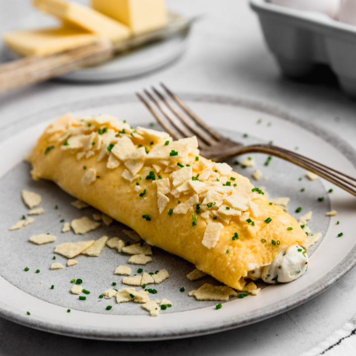 Torta (Bolillo) de huevo batido tipo omelette con cama de frijolitos sazonados y en la tapa queso Oaxaca Gratinado.