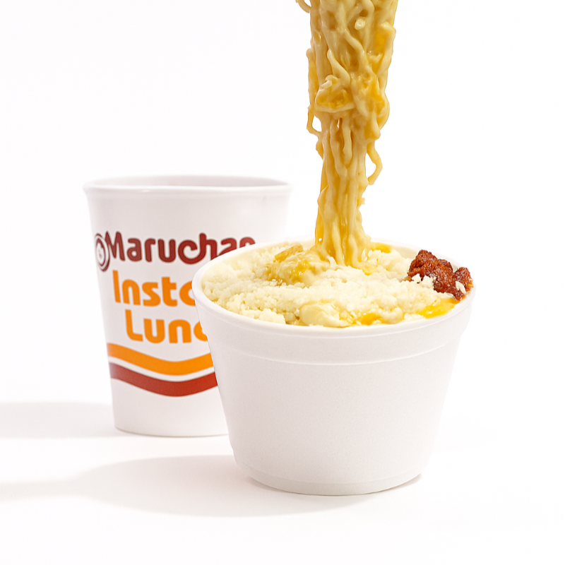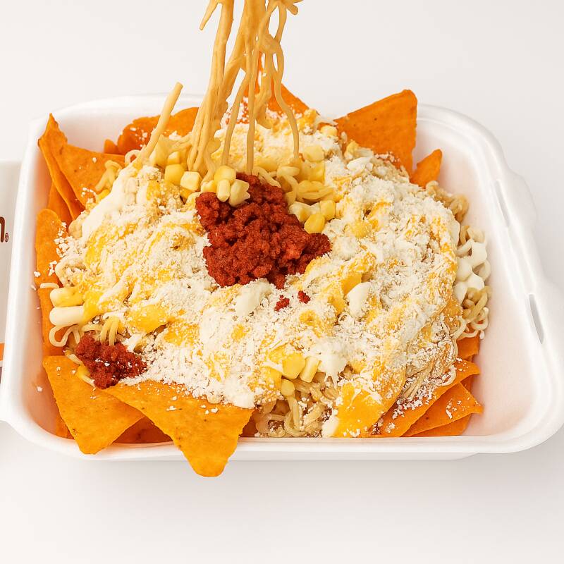 Maruchan preparada con elote, crema, mayonesa, queso amarillo, queso blanco, chile y limón. Se envía en un contenedor de 16 oz.