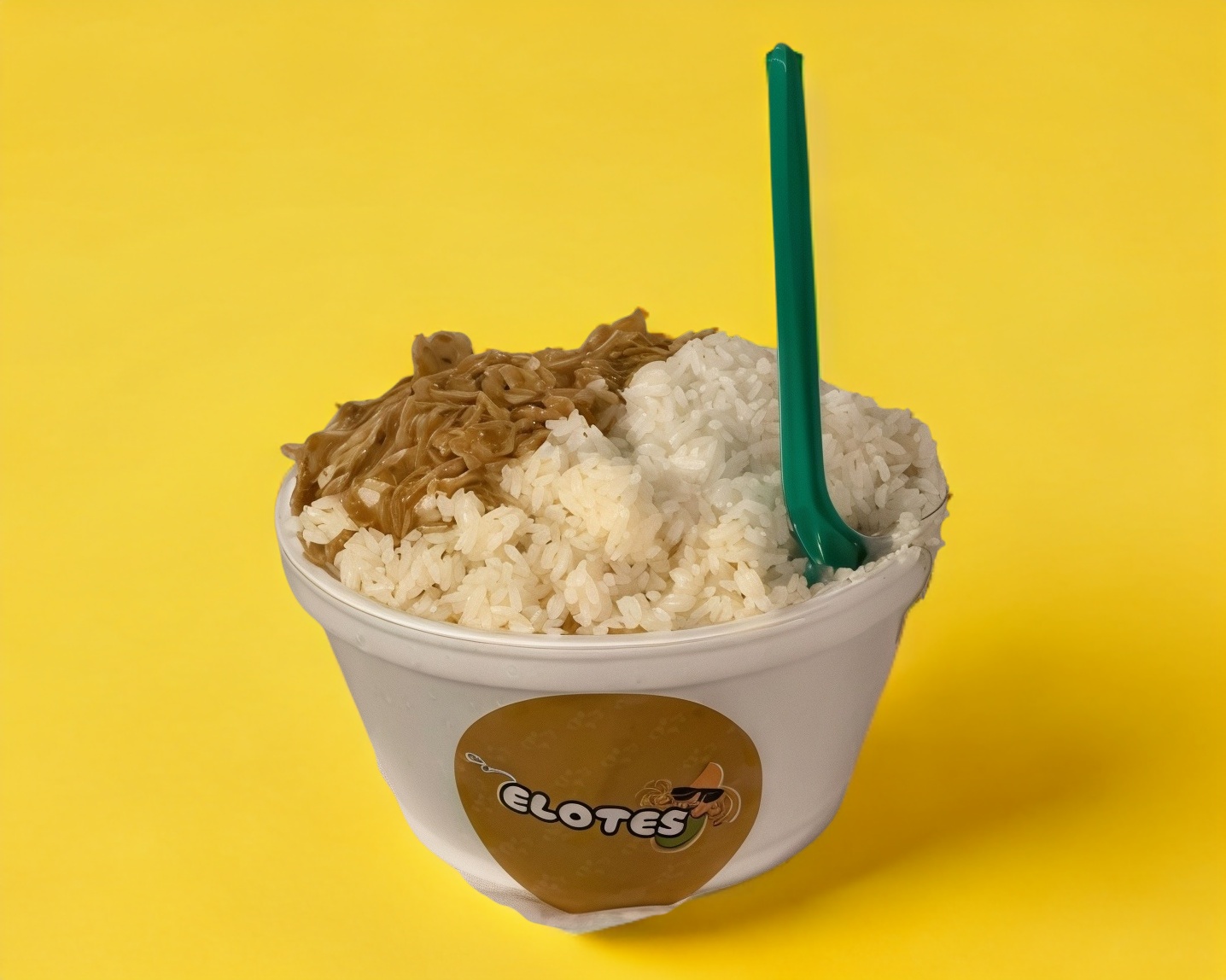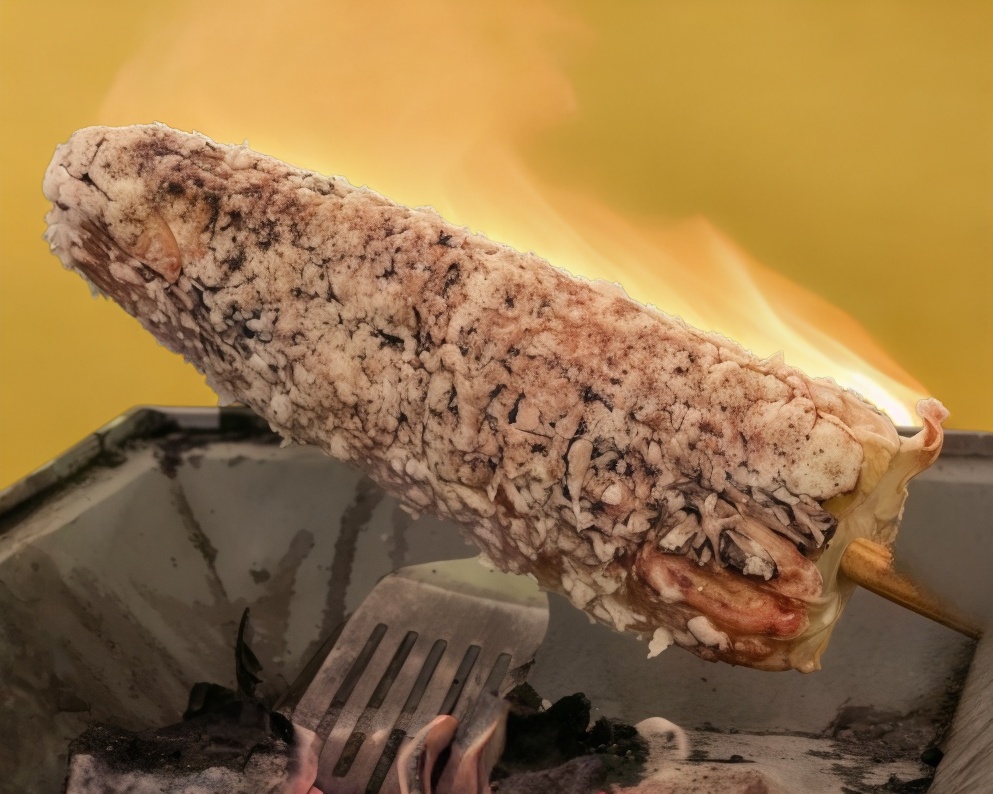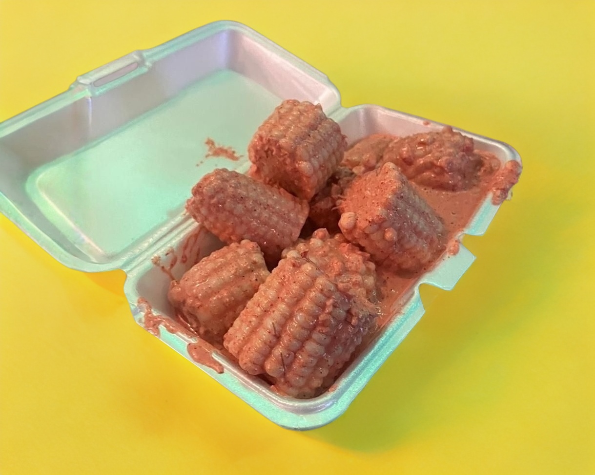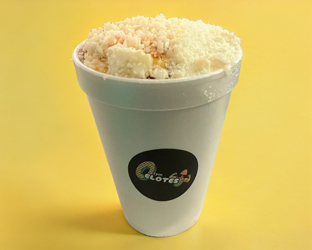 Un elote entero más medía mitad de elote, dorado con mantequilla, más elote desgranado y preparado a tu elección
