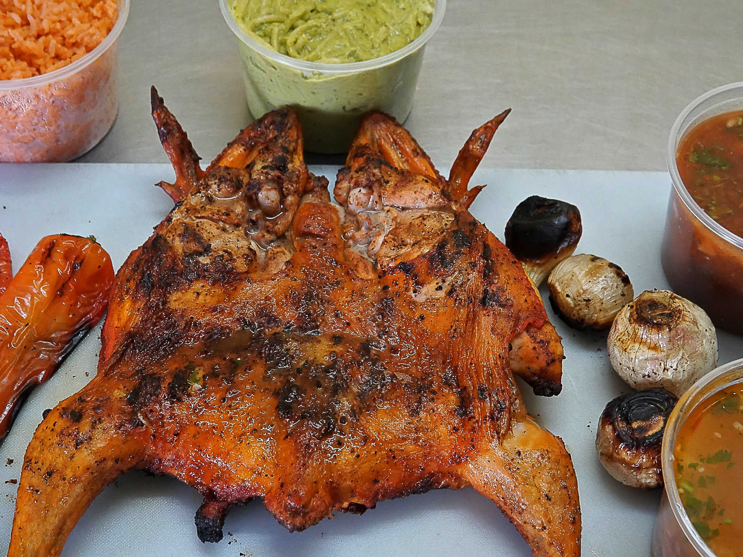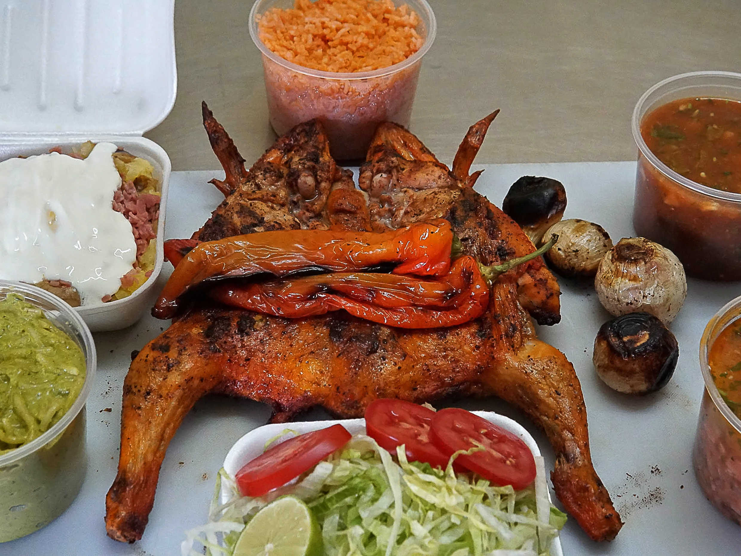 Pollo asado al carbón, acompaña dé salsa, cebollitas , chilitos toreados, elige uno de nuestros complementos arroz, espagueti, frijoles charros o papa clásica.