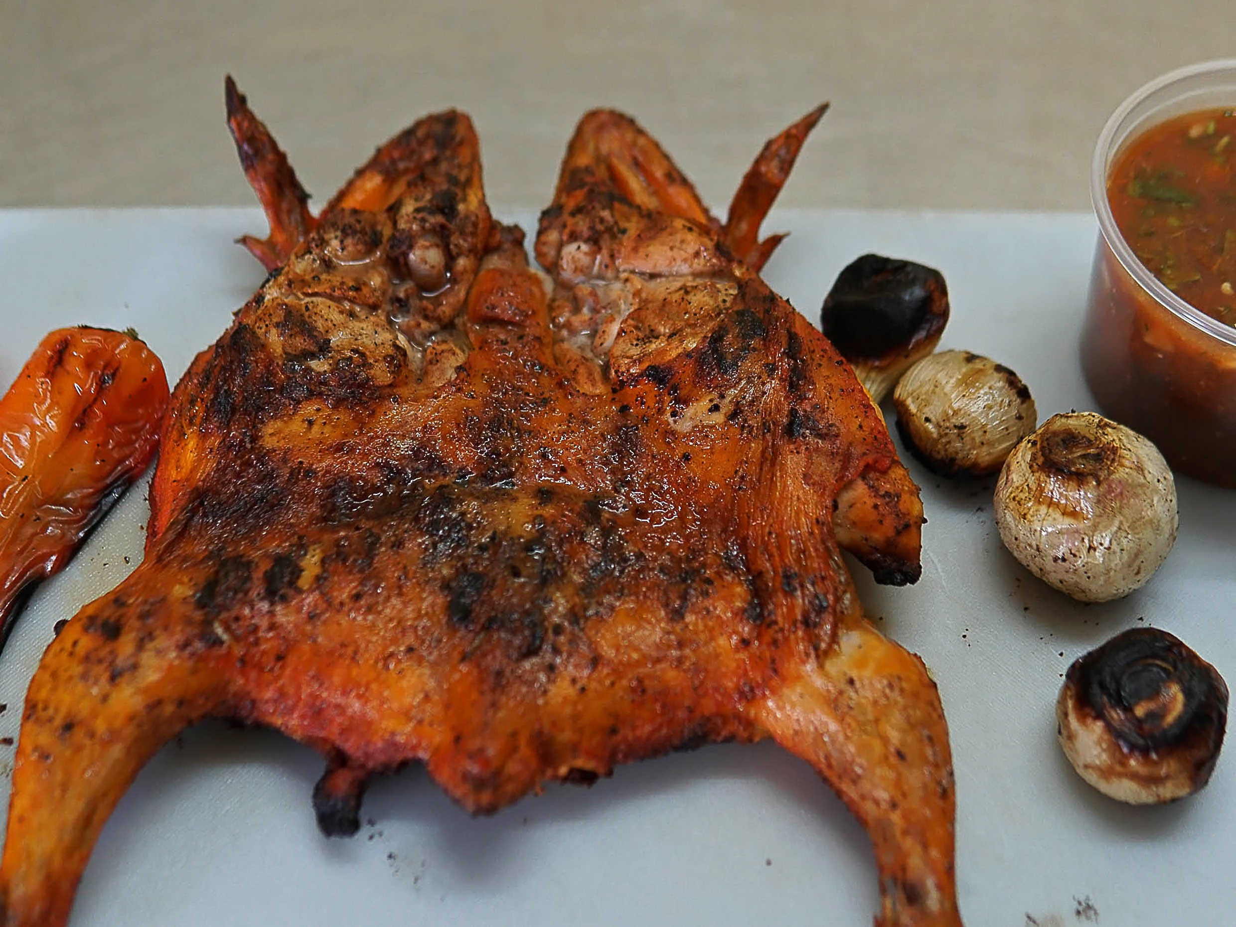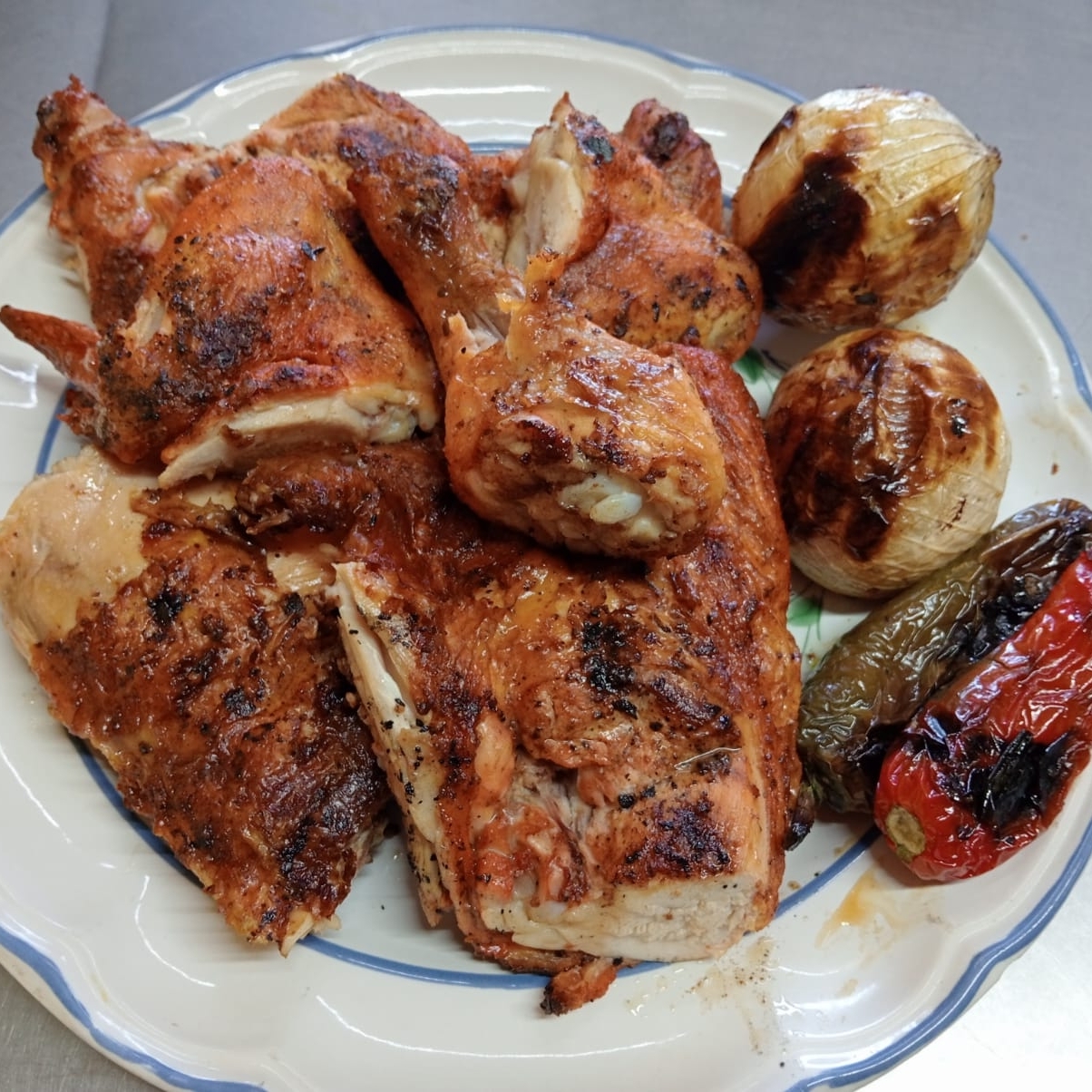 Pollo asado al carbón en salsa BBQ, acompañado de salsa, cebollitas ,chilitos toreados y tortillas