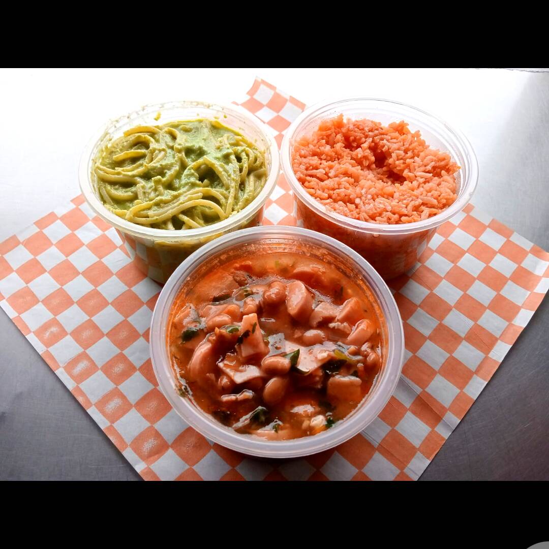 1/2 litro de arroz, 1/2 litro de frijoles charros, 1/2 litro de spaghetti, 1 papa clásica