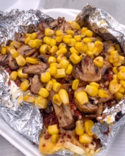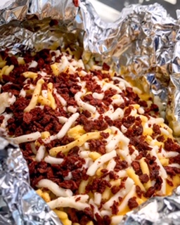 Margarina, queso cheddar, queso mozzarella, crema, imitación tocino y pimiento.
