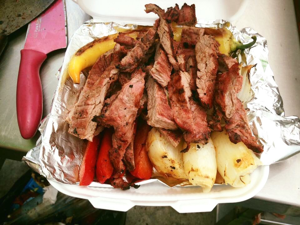 1/2 kilo de arrachera en fajitas, cebollitas y chiles toreados.