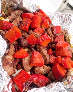 1 kilo de arrachera en fajitas, frijoles charros, tortillas, salchichón, cebollitas, chiles toreados, ensalada, pico de gallo, guacamole y salsa.