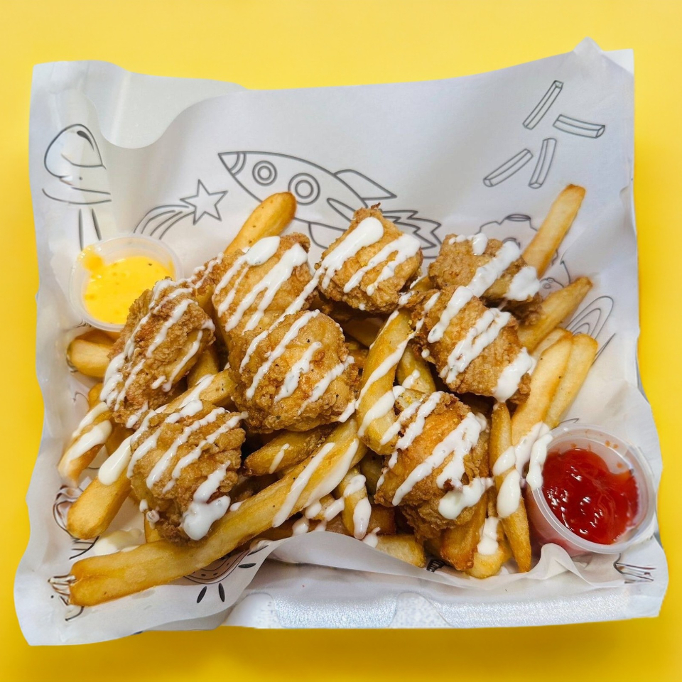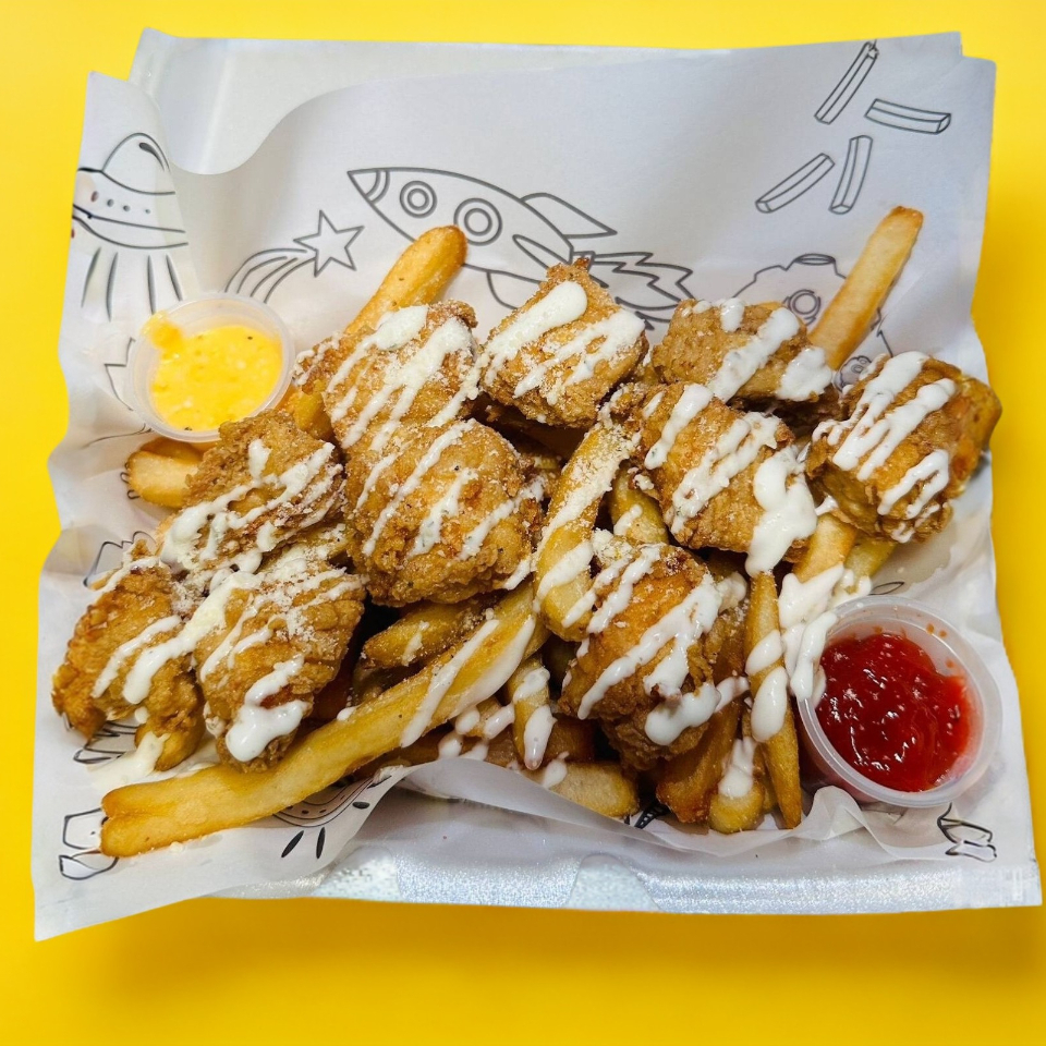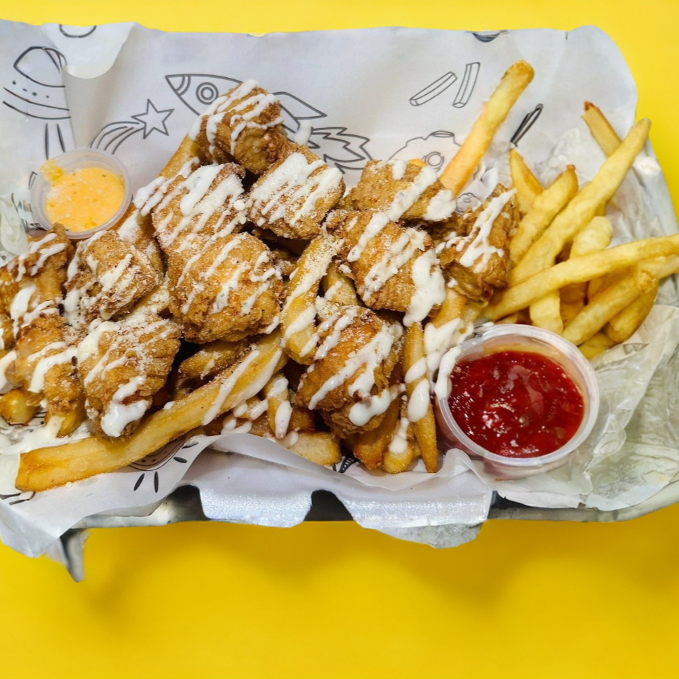 300 gr de papas a la francesa, 4 boneless con las salsas y aderezos de tu elección.