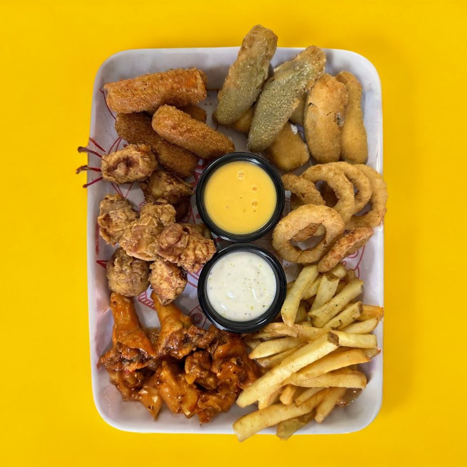 Vive la gran experiencia con tu pareja, amigos ó solo para ti de saborear (8) Alitas, (8) Boneless, (6) Dedos de quesos, (6) Jalapeños Philadelphia, (6) Aros de Cebolla y (150) gr de papas acompañado de (2) salsas de tu preferencia.