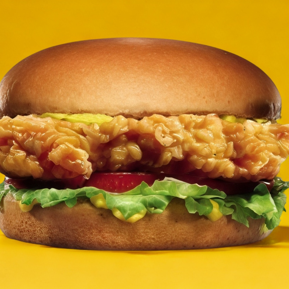 Pan brioche, Pechuga de pollo empanizada, Queso americano, Lechega, Tomate, Cebolla morada, Aderezo.