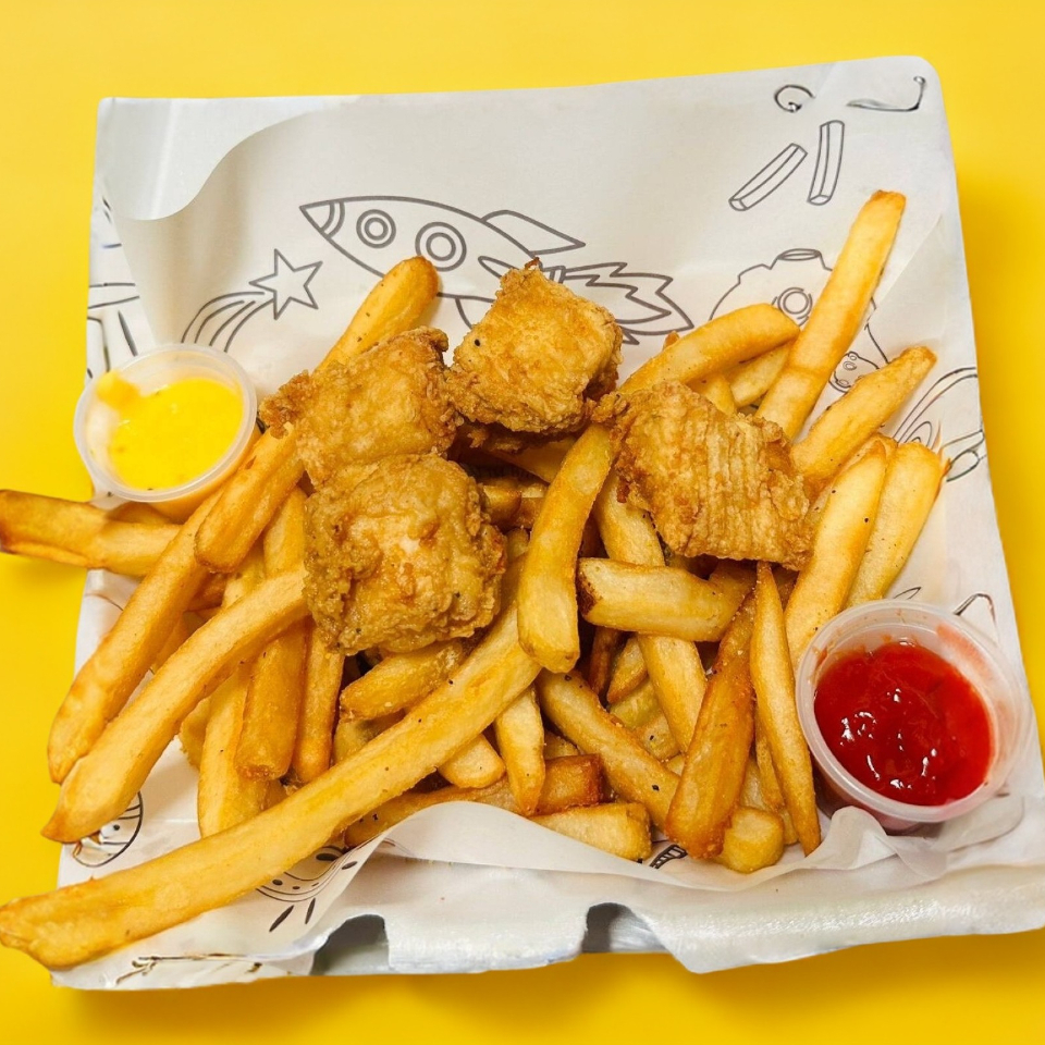 6 nuggets de dinosaurio + 150 gramos de papas + 1 jugo cajita