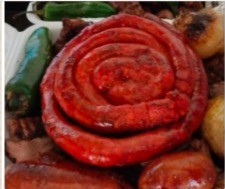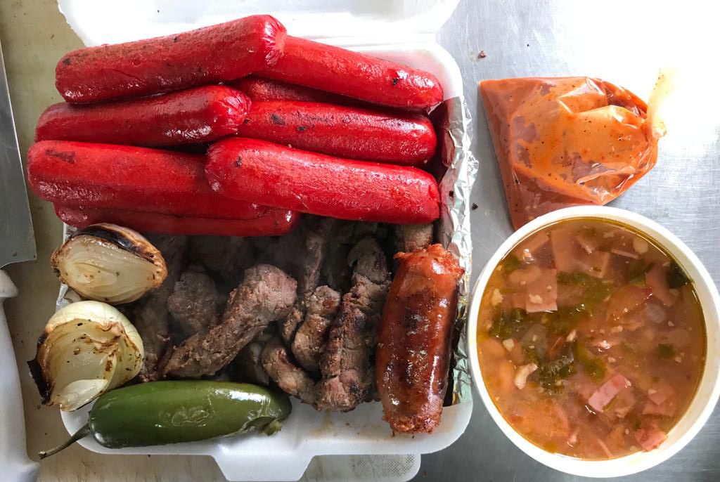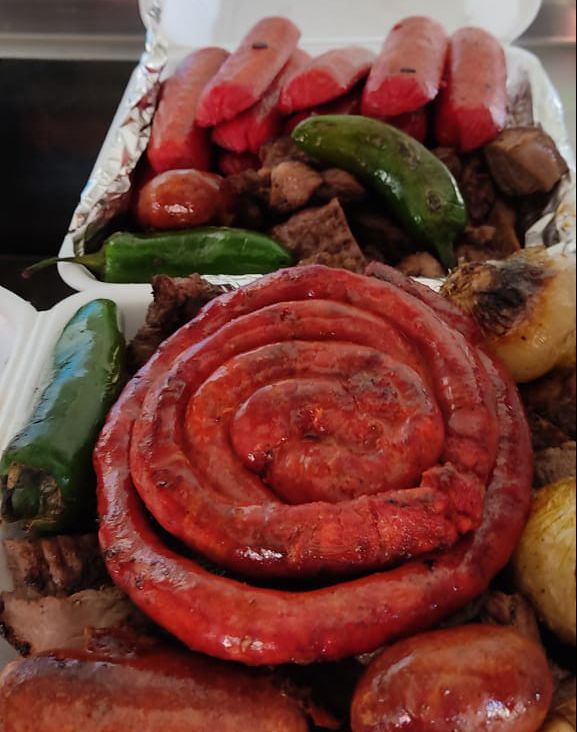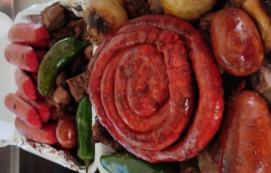 3kg. de arrachera, 2 chorizos españoles, 2 chistorras, 1lt. de frijoles, 7 salchichas asadas, cebollas, chiles y salsa.