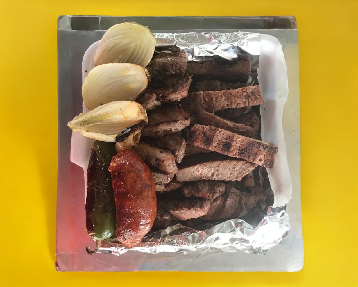 2kg. de arrachera, chorizo español, chistorra, 1/2lt. de frijoles charros, 5 salchichas asadas, cebollas, chiles y salsas.