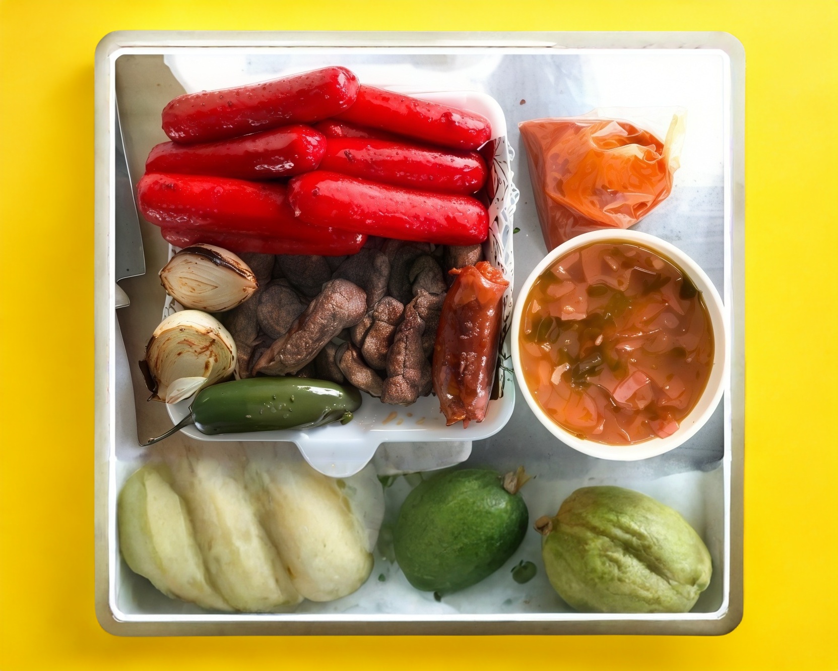 1kg. de arrachera, 1/2lt. de frijoles charros, 1 chorizo español, 5 salchichas asadas, cebollas, chiles y salsas.