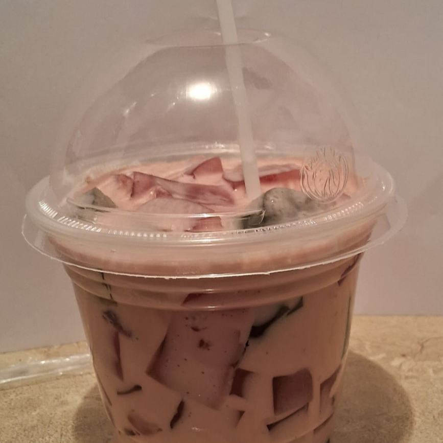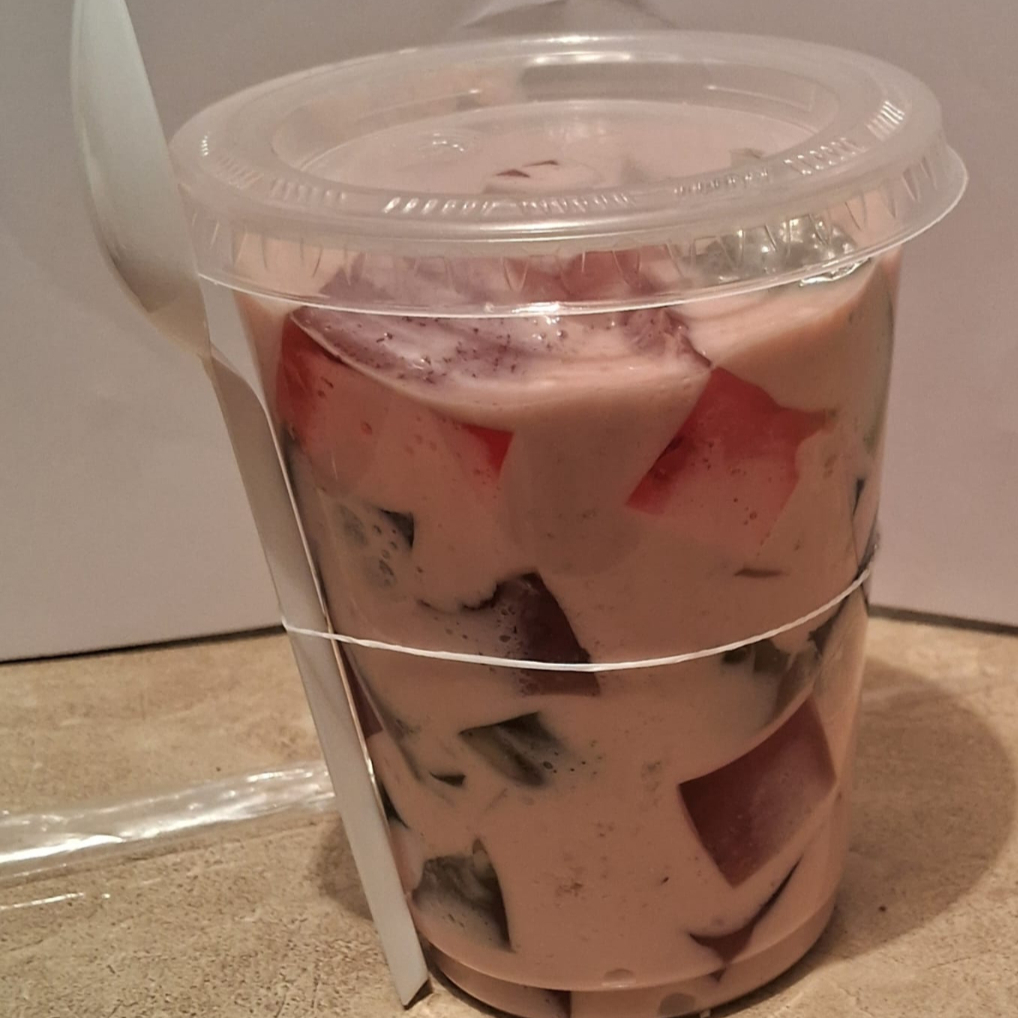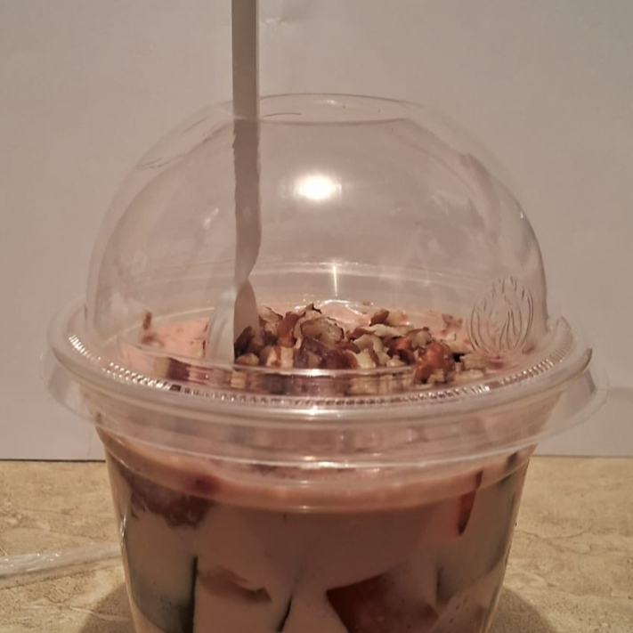 Gelatina de fresa y limón servida con una preparación cremosa con cubierta de chantilly y espolvoreada con nuez